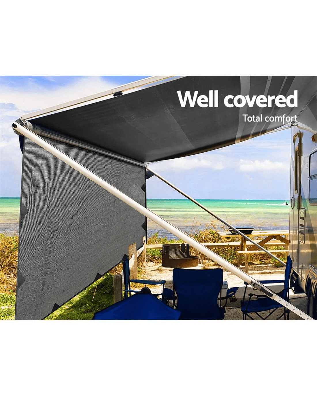 The quality screen features water-repellent polyethylene fabric with hemmed edging to prevent fraying and heavy-duty stainless steel D-rings attachment joints. Not least, the screen is compatible for use with popular roll-out awning brands such as Carefree Fiesta and Domestic A&E. And when it's time to move on, the screen can be easily stored in the included carry bag for safekeeping.