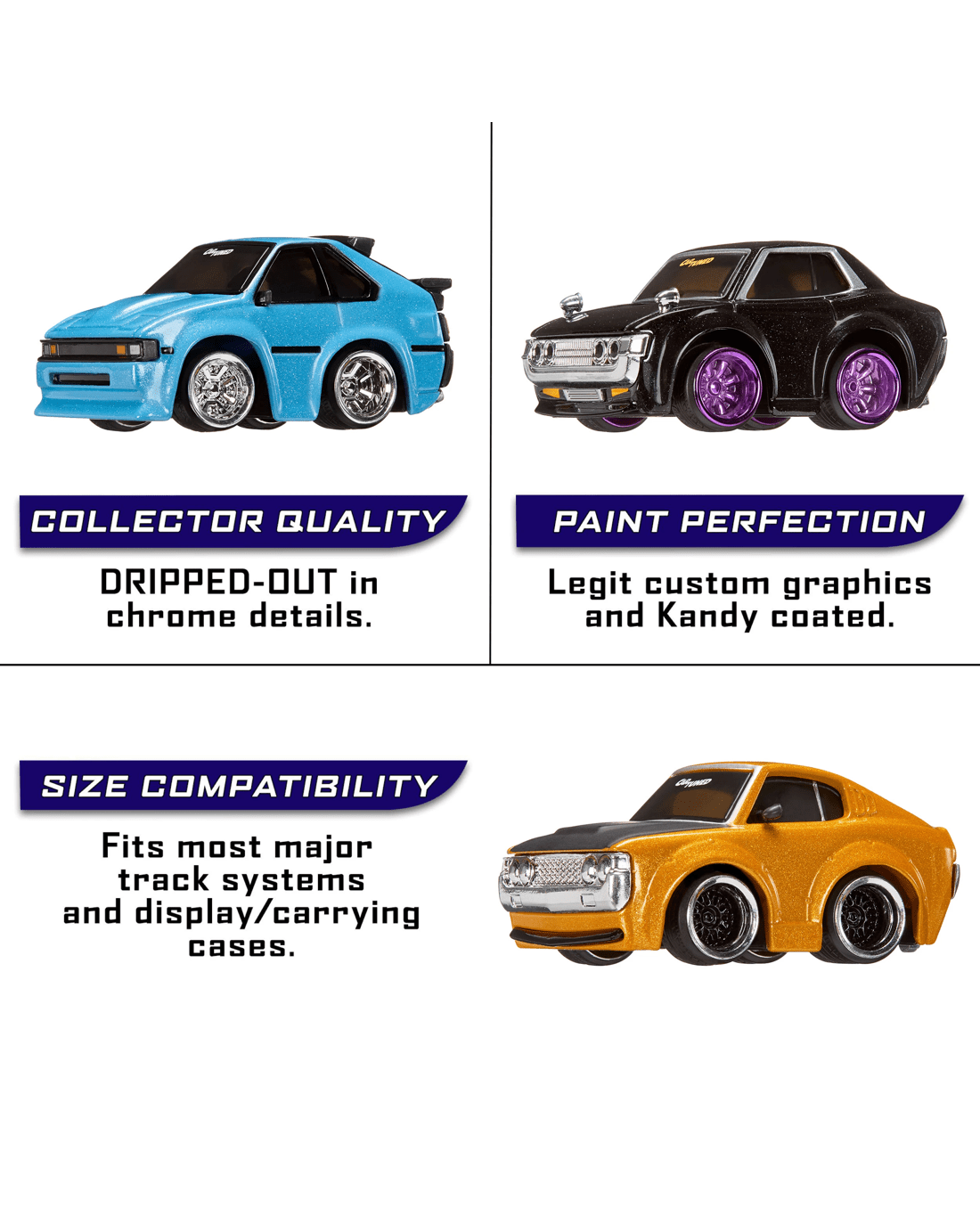 - COLLECTOR QUALITY: CarTuned™ diecast vehicles come DRIPPED-OUT in chrome details. Rock’n real rubber tires, for that silky smooth cruise. With metal bodies, these heavy hitters come in at 40+grams. The DETAILED WHEELS help set off the SLAMMED STANCE while still rolling with ease.