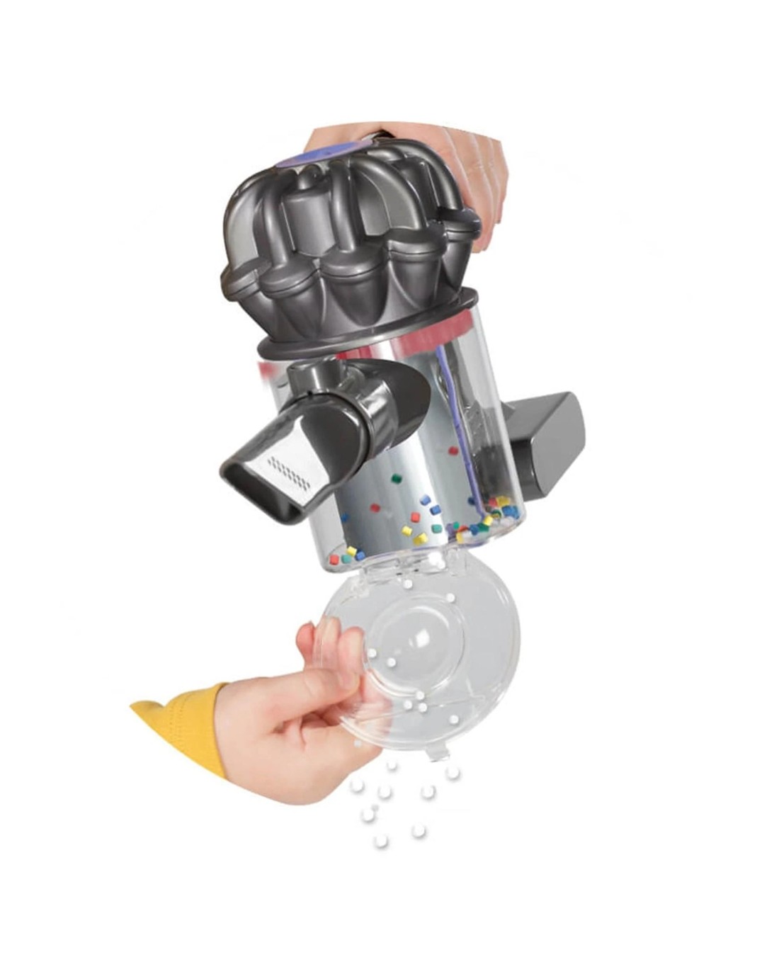 The Casdon Dyson Cord-Free roleplay toy vacuum cleaner is a replica based on the real Dyson V6 cord free vacuum cleaners. This fantastic Dyson toy vacuum cleaner is a fantastic kids vacuum featuring working suction, simulated cyclone action, realistic sound and also come complete with different attachments, which encourages various ways to play. The Dyson toy vacuum includes attachments such as a short nozzle and also the standard brush bar head. It can transform from a floor vacuum into a handheld unit, meaning it will be able to reach even the tightest of spots. The vacuum will pick up bits of fluff and dust so your child can really help with the housework. Built into the vacuum is a handy dust compartment, which makes it easy to empty your rubbish into the bin. One hand easy removal system for changing nozzles.