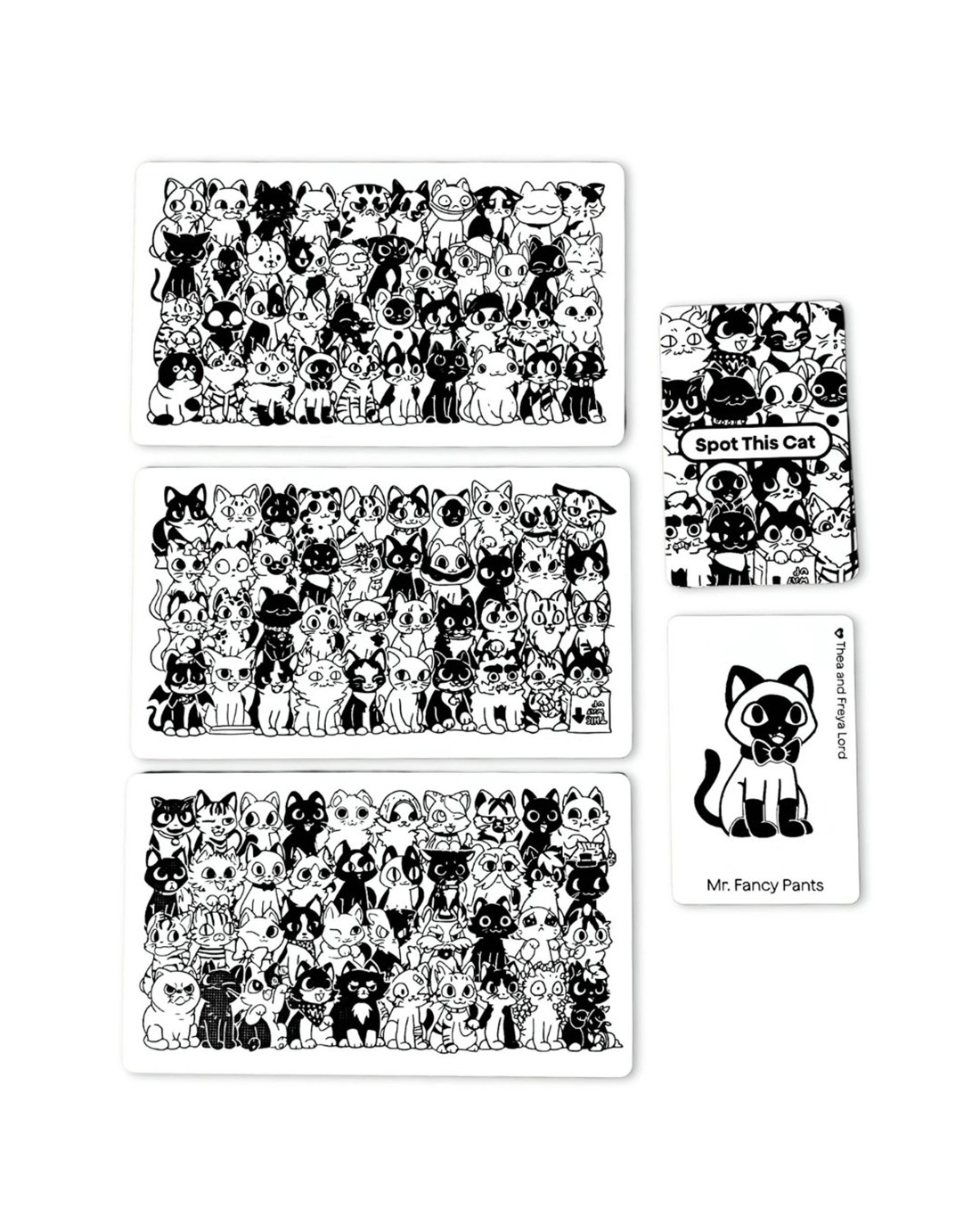 Each game requires a set of Crowd Cards and some Cat Cards, depending on the game. A cat will ONLY be on 1 of the 3 Crowd Cards. They will look exactly as pictured on the Cat Card, although part of it may be hidden behind other cats.