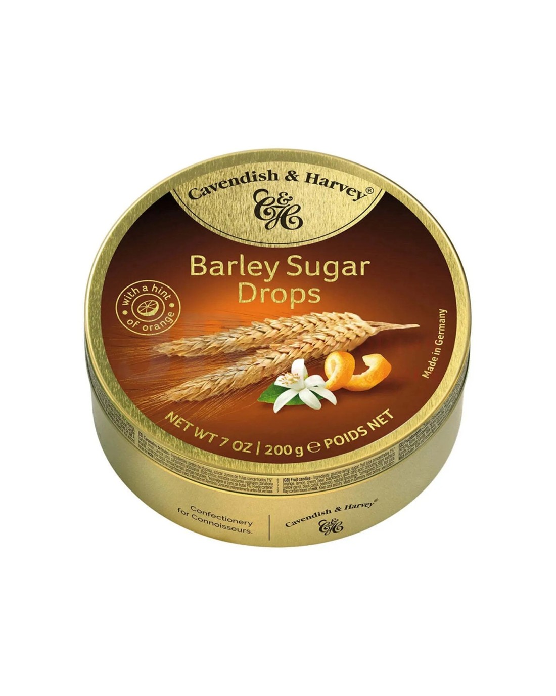 Cavendish and Harvey Barley Sugar Drops,Discover the unmistakable taste of barley sugar with just a hint of orange. Cavendish and Harvey Barley Sugar, are dusted with icing sugar and sealed in a premium gold tin for the highest quality freshness. Orange and malt flavoured candies.