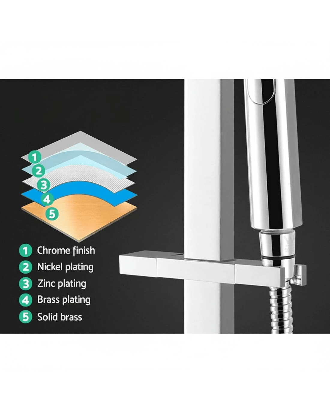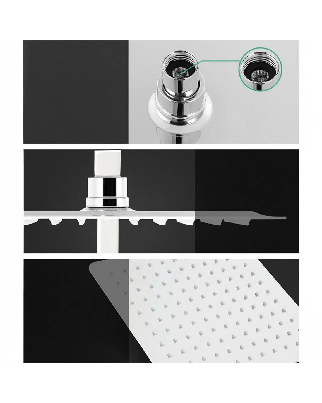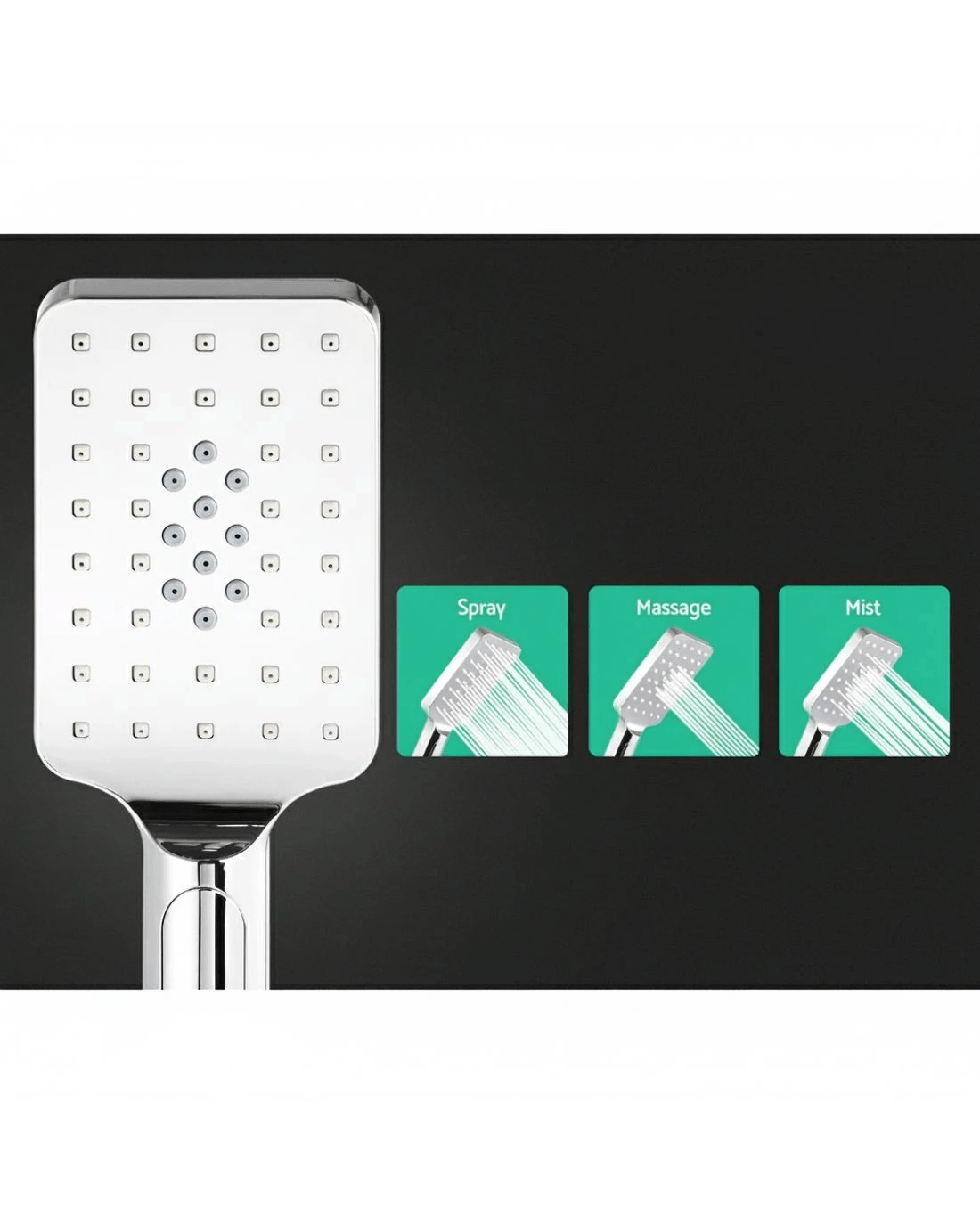 Overhead shower head size: 25.5cm x 25.5cm
