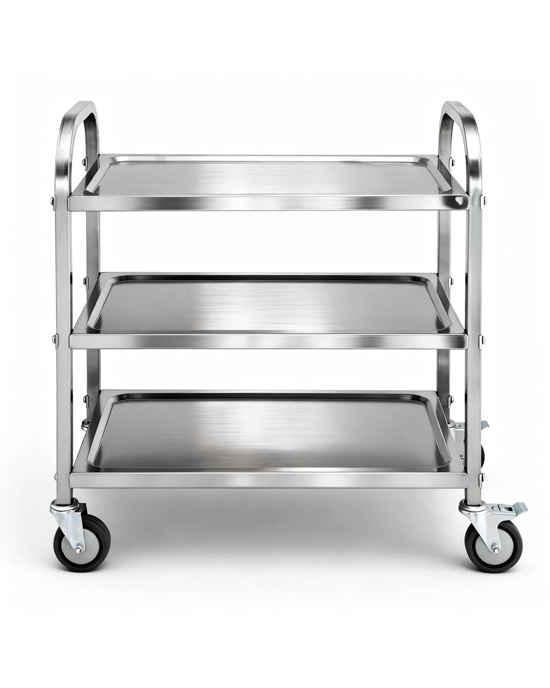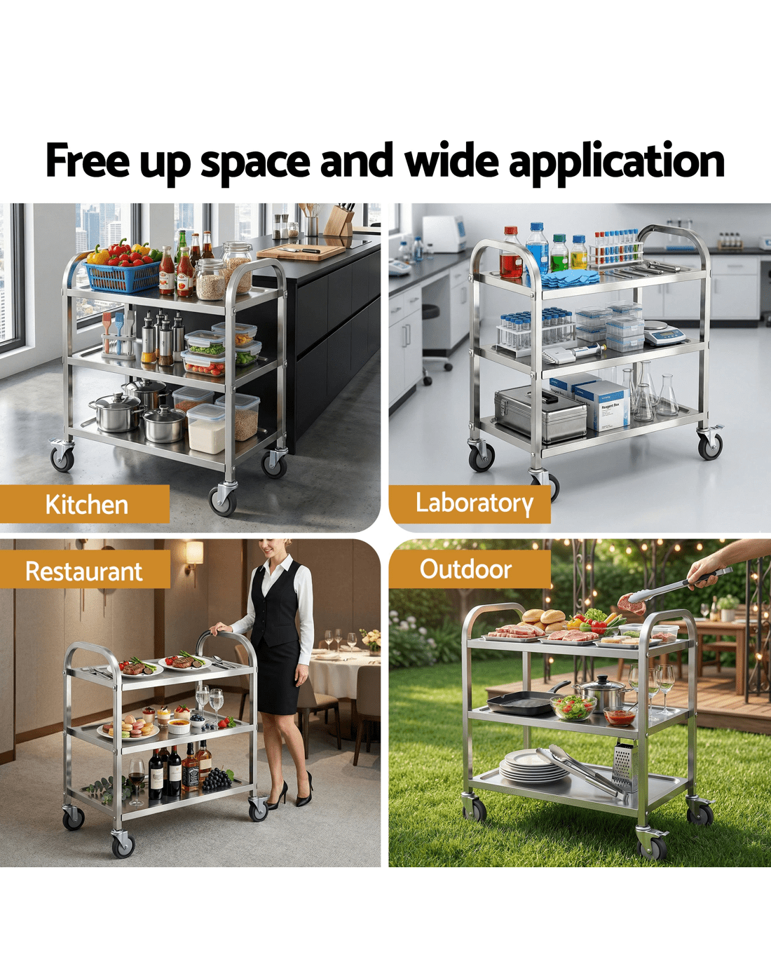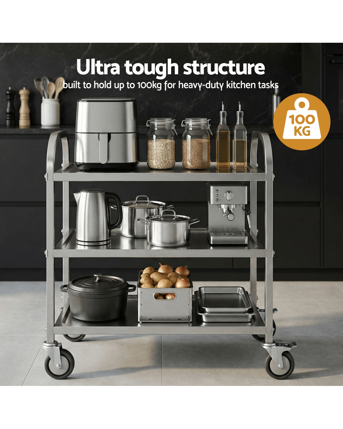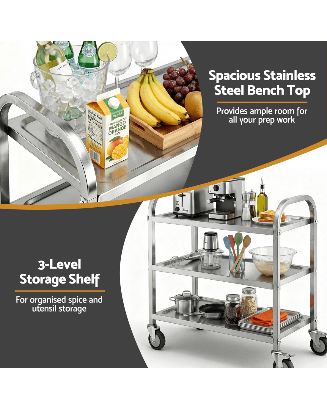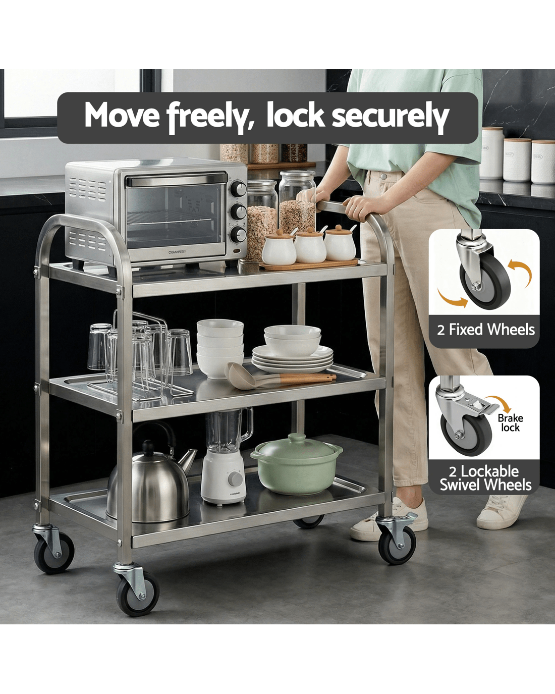 Need extra bench space that moves with you? This stainless steel kitchen trolley is your solution! Built with 201 stainless steel, it offers durable and cost-effective performance for everyday kitchen use. The 3-tier design provides flexible storage and workspace, while lockable castors let you wheel it anywhere and secure it in place.