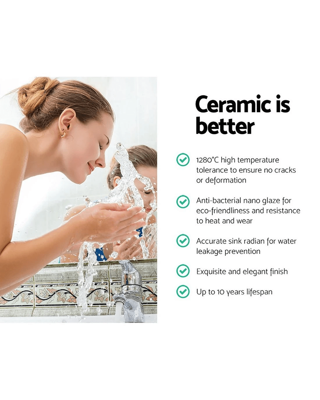 Finished in high gloss crystalline ceramic, this nano glazed sink is designed to be a healthier and more durable alternative to lesser quality sinks. It is resistant to cracks, scratches, fading, heat and wear as well as to bacteria. Use it with total peace of mind. Plus, its premium ceramic qualities also mean that it has a water absorption rate of less than 0.5%, making it extremely dense and practically impervious to any kind of liquid. Essentially, an attribute of exceptional quality that amplifies confidence in our product.