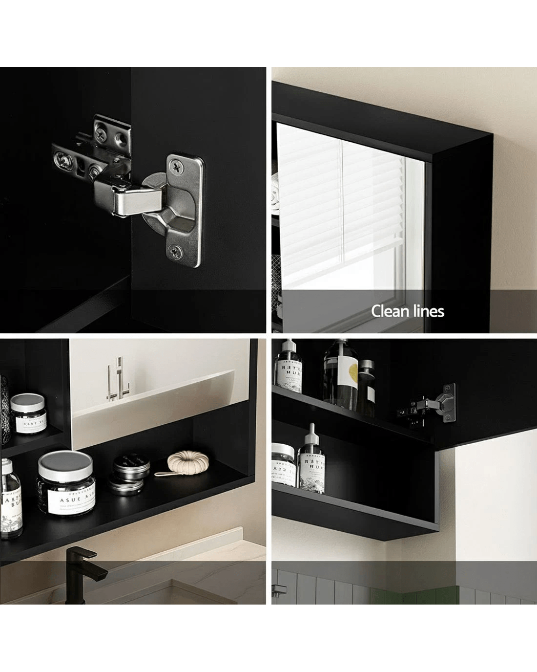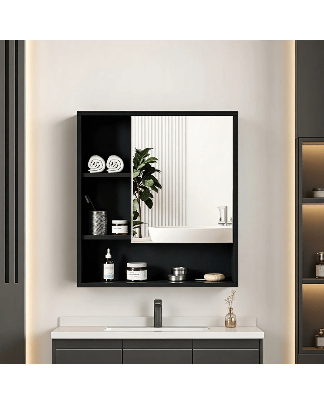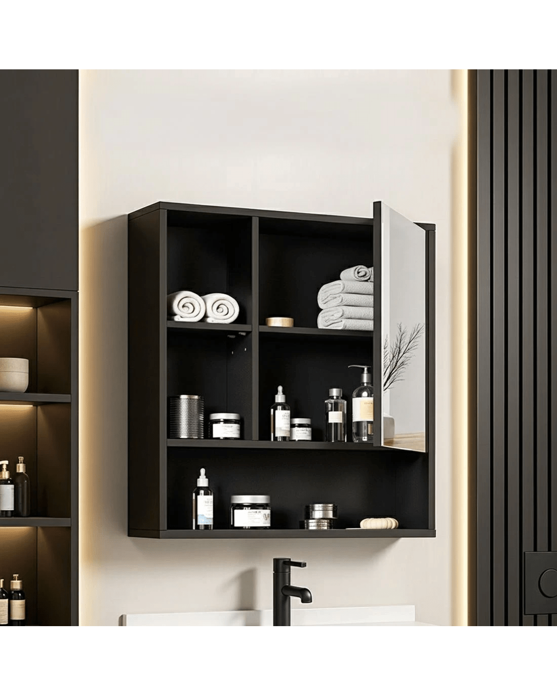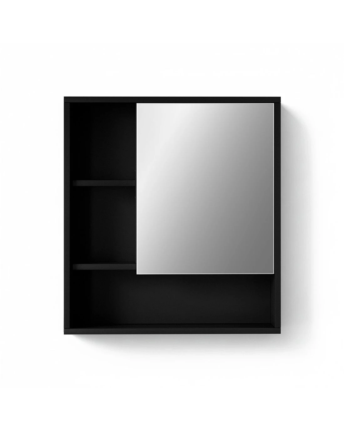 This sleek black mirror cabinet combines modern style with practical storage for your bathroom. The high-definition mirror provides excellent reflection while concealing generous storage space behind its seamless door. Adjustable shelves allow you to customise the interior layout for toiletries, medicines and personal items. Crafted from water-resistant PB melamine, this unit withstands humid conditions while maintaining its elegant appearance. Easy to install and maintain, it's the perfect solution for keeping essentials organised without compromising on style.