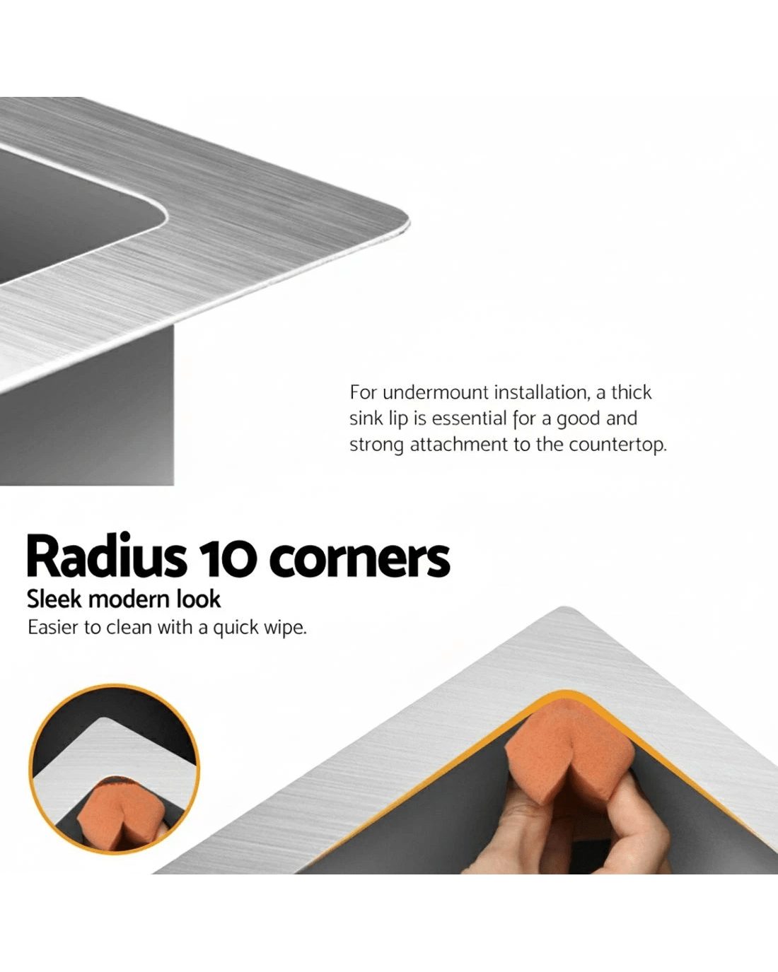 The Cefito Handmade Stainless Steel Sink is built to exacting standards so that you get the very best of quality materials and craftsmanship. It is crafted from heavy-duty food grade 304 stainless steel, unlike others that are made from inferior 201 grade or 304 imitations. Built to be scratch-proof, oil-proof and more importantly, bacteria-free, the silky-smooth satin-coated stainless-steel sink also features an X-flume design for easy drainage, deep and wide bowl for practicality, eco-friendly anti-condensation paint, and five sound-deadening pads. Suitable for drop-in, flush-mount or under-mount installation, our stainless steel sink should have a definitive place in your uncompromising kitchen.