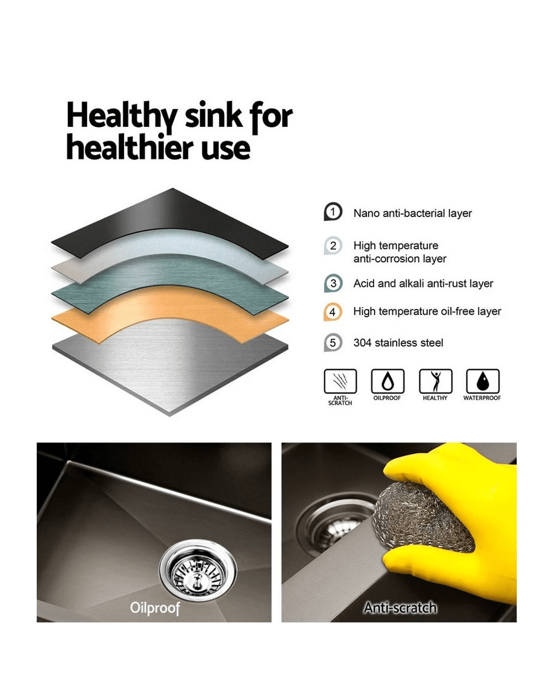The Cefito Stainless Steel Sink is built to exacting standards so that you get the very best of quality materials and craftsmanship. It is crafted from heavy-duty food-grade 304 stainless steel comprising a minimum of 18% chromium and 9% nickel. The surface is nano-coated to be scratch-proof, oil-proof and more importantly, bacteria-free. The sink also features an X-flume design for easy drainage, eco-friendly anti-condensation paint, sound-deadening pads and R10 rounded corners for safety and easy cleaning. Suitable for drop-in, flush-mount or under-mount installation, our stainless steel sink should have a definitive place in your uncompromising kitchen.
