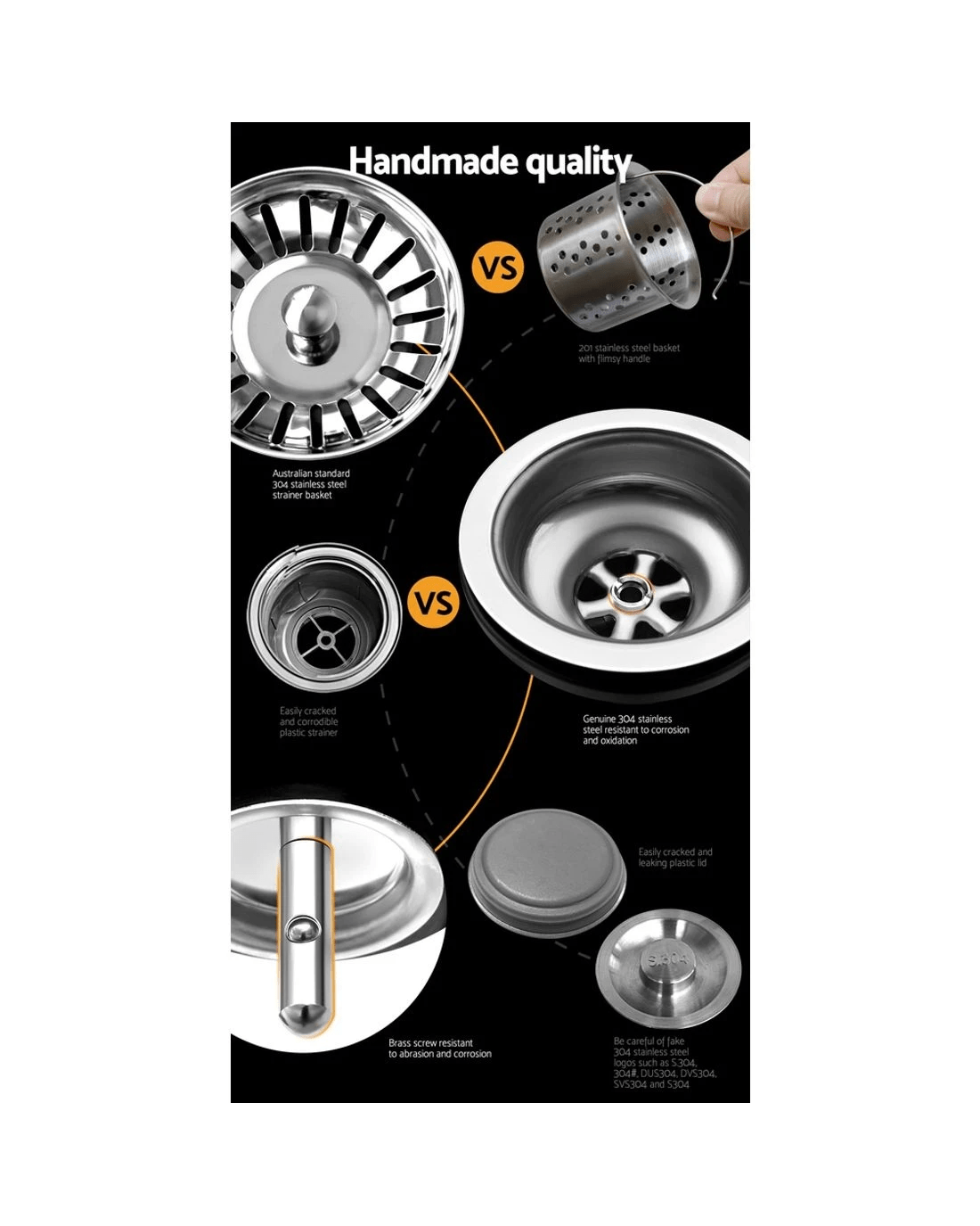 The Cefito Handmade Stainless Steel Sink is built to exacting standards so that you get the very best of quality materials and craftsmanship. It is crafted from heavy-duty food grade 304 stainless steel, unlike others that are made from inferior 201 grade or 304 imitations. Built to be scratch-proof, oil-proof and more importantly, bacteria-free, the silky-smooth satin-coated stainless-steel sink also features an X-flume design for easy drainage, deep and wide bowl for practicality, eco-friendly anti-condensation paint, and five sound-deadening pads. Suitable for drop-in, flush-mount or under-mount installation, our stainless steel sink should have a definitive place in your uncompromising kitchen.