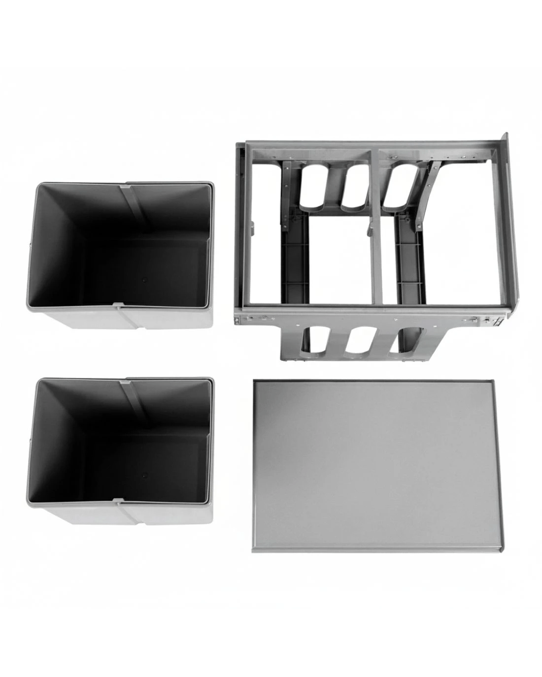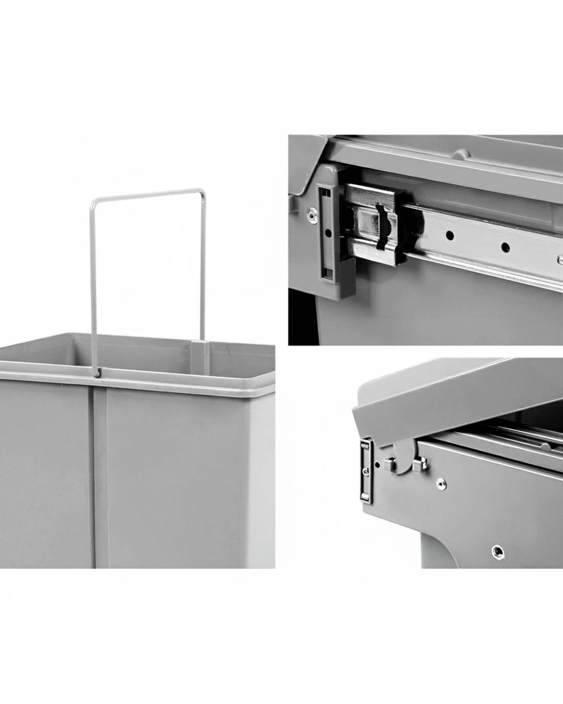 Clear your kitchen waste conveniently with our Pull-Out Bin that conceals inside your kitchen cabinet perfectly. With a 15-litre capacity for each plastic waste bin, the Pull-Out Bin comes in compartments with lids that allows you to separate your waste from each other as well as from your recycling items. Included too is a under bench frame to hang any plastic waste bag if required. The removable plastic lids help to prevent odours from leaking out and the sturdy metal runners ensure smooth sliding in and out. The plastic waste bins also come with individual metal handles for easy lifting out for garbage disposal and subsequent cleaning. It's easy to install and does not take up valuable floor space in your kitchen. Out of sight and free of odours. Get your kitchen looking and smelling refreshingly good always with our concealed Pull-Out Bin.