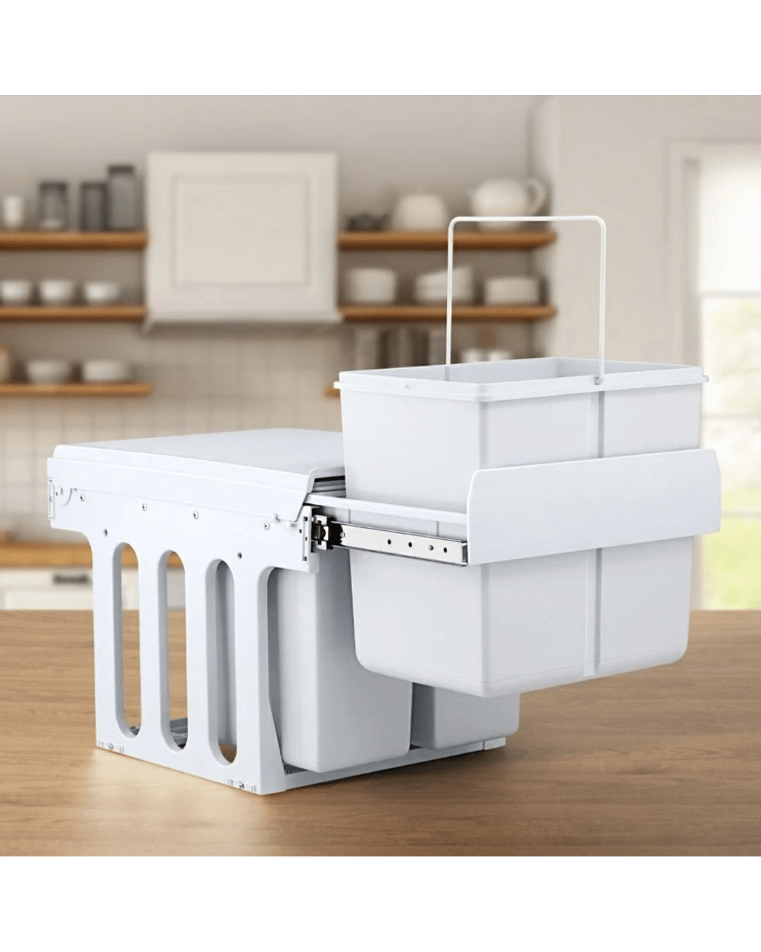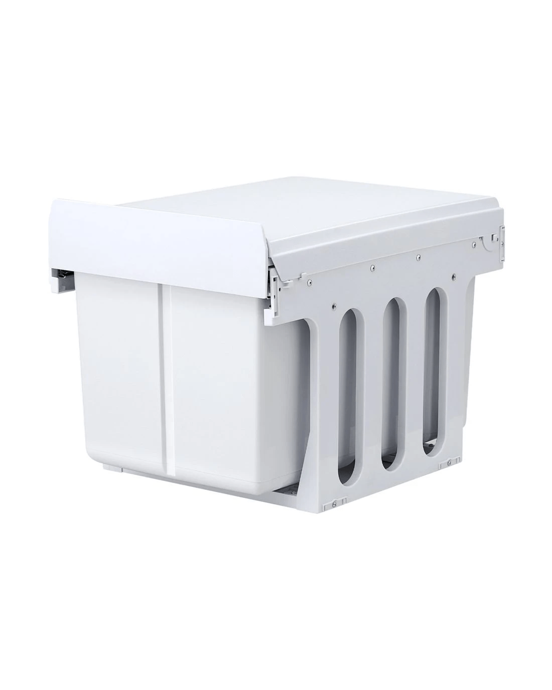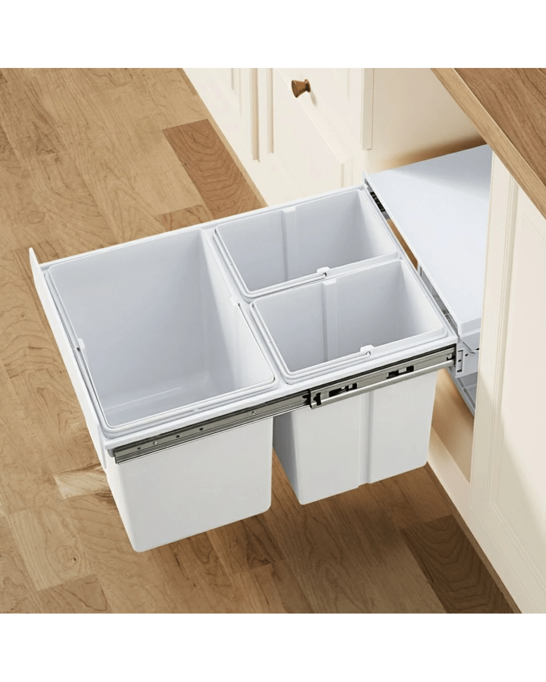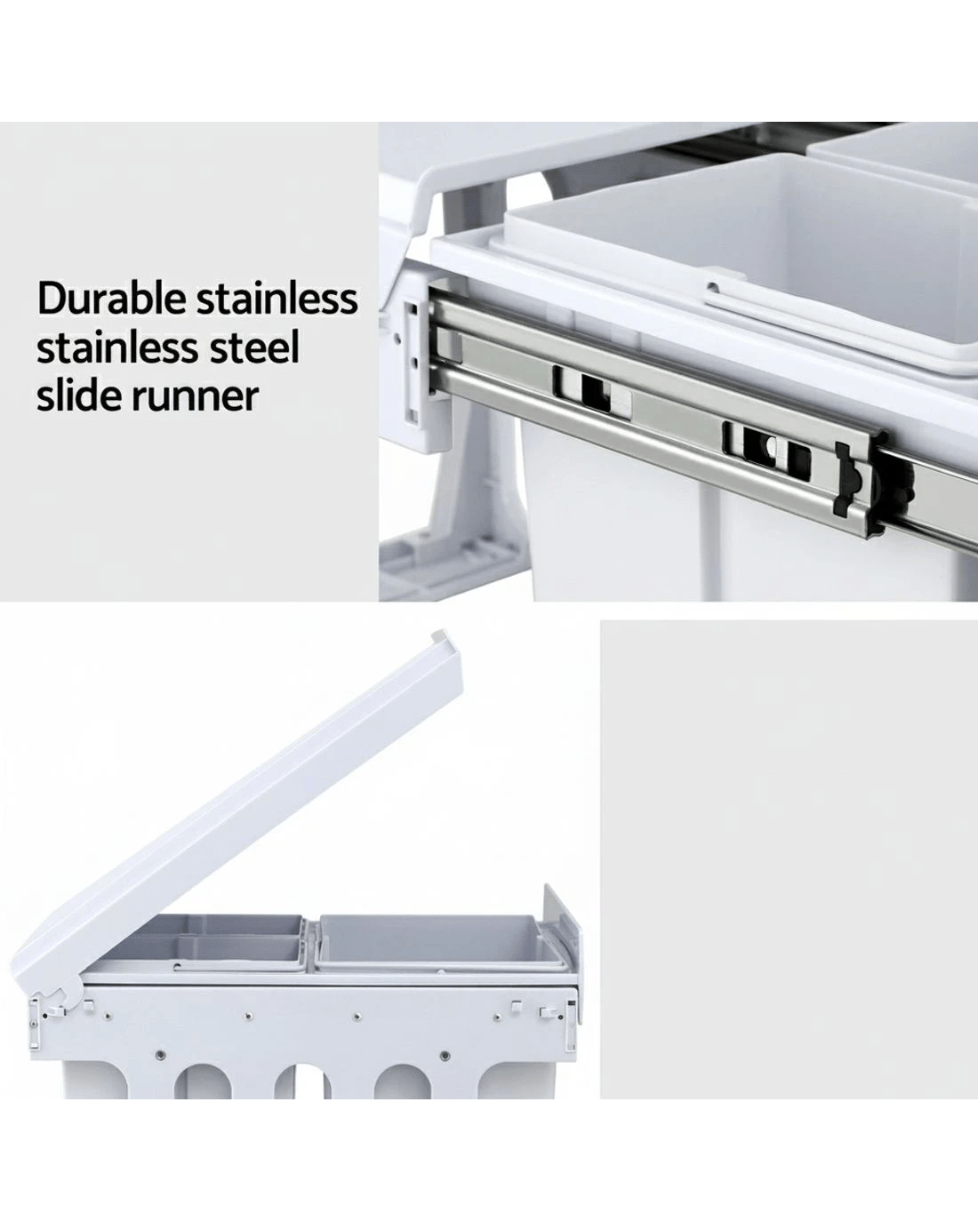 Clear your kitchen waste conveniently with our Pull-Out Bins that conceal inside your kitchen cabinet perfectly. With a 15-litre and two 8-litre capacity for each plastic waste bin, the bins come in compartments with lids that allows you to separate your waste from each other as well as from your recycling items. The removable plastic lids help to prevent odours from leaking out and the sturdy metal runners ensure smooth sliding in and out. The plastic waste bins also come with individual metal handles for easy lifting out for garbage disposal and subsequent cleaning. It is easy to install and does not take up valuable floor space in your kitchen.