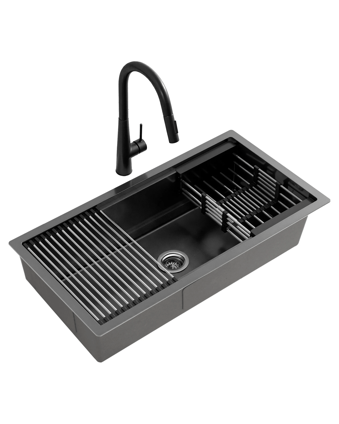 Heavy-duty 304 stainless steel (18% Cr/9% Ni) sink with 3mm thickness, nano-coating, X-flume drainage, and R10 corners. Includes sound pads and anti-condensation paint. Supports drop-in, flush, or under-mount. Note: Colour may vary by lighting.