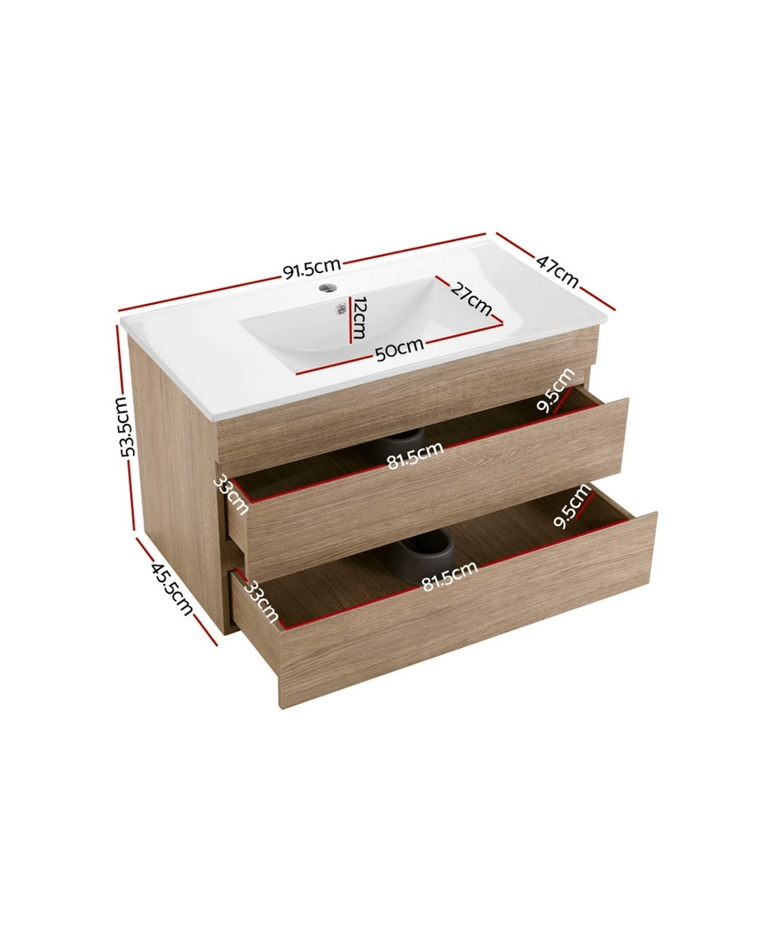 Add a touch of modernity to your bathroom with our Cefito Bathroom Vanity Unit. With its E1 and MDF board construction and melamine finish, the vanity unit looks absolutely flawless and feels strong and stable with every day use. On top, the crystalline nano-glaze ceramic basin is smooth and highly resistant to scratches, leaks or bacteria growth. Better still, there is ample room for all your bathroom essentials inside with the two deep drawers. Not least, the two-tone oak cabinet and white basin colour combination is a definite plus for your modern bathroom.