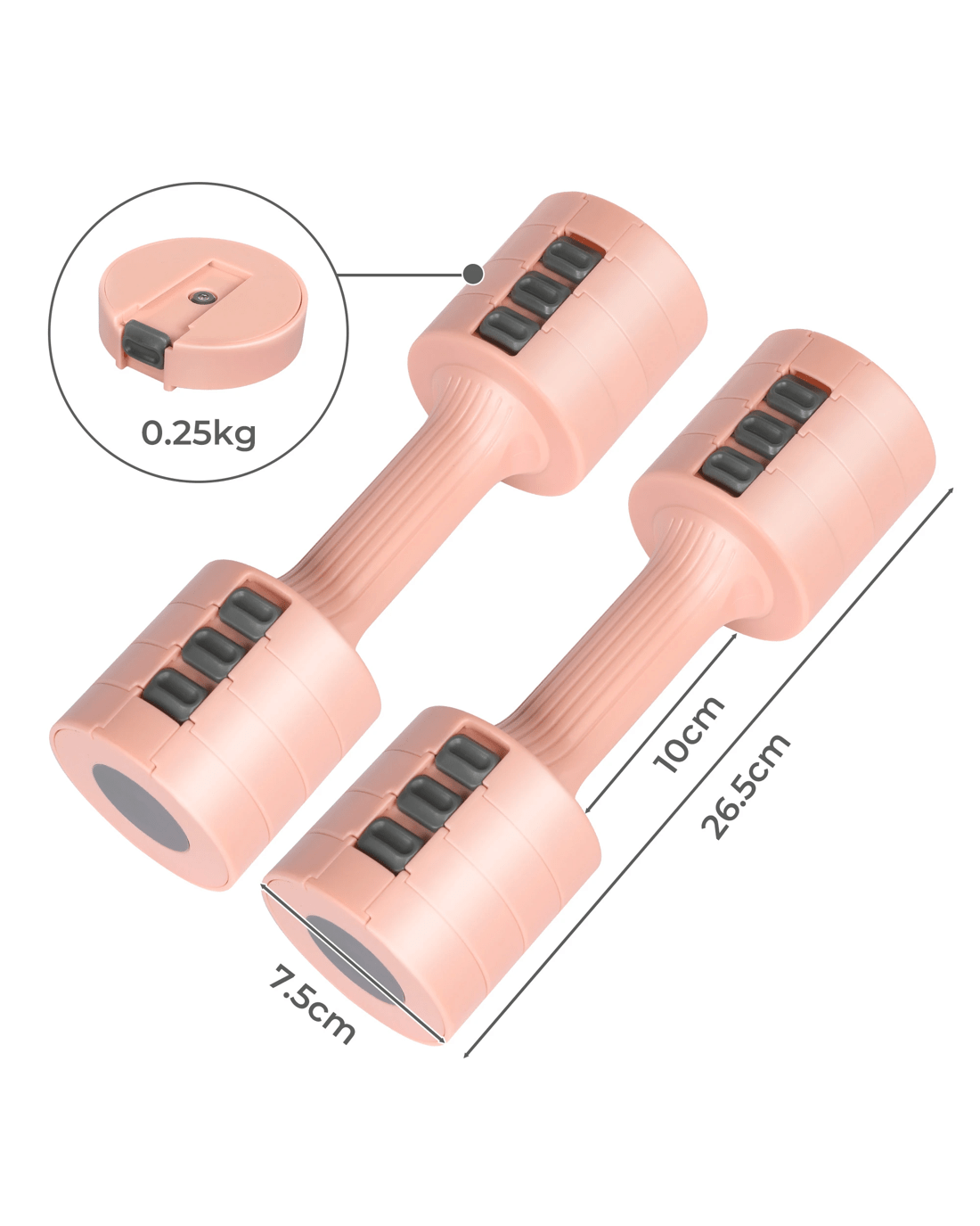 This adjustable dumbbell offers 4 different weight settings, ranging from 1kg to 2.5kg for a single dumbbell and from 2kg to 5kg for a pair of dumbbells.