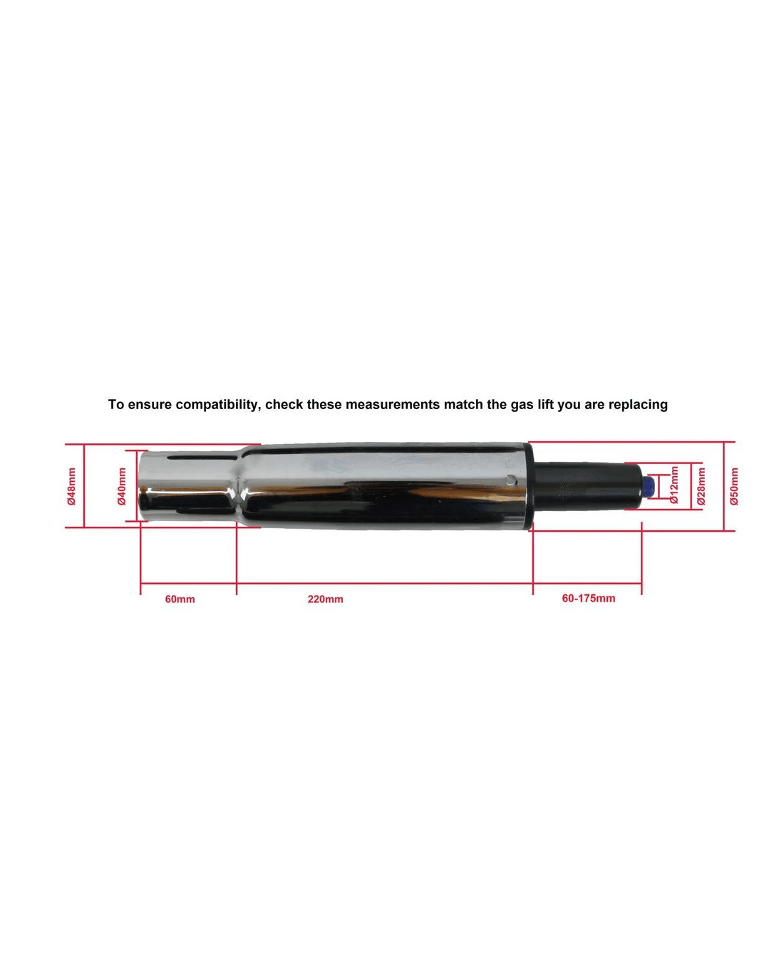 - To ensure compatibility, check the gas lift you are replacing matches the dimensions of this gas lift by referring to the dimensions image.