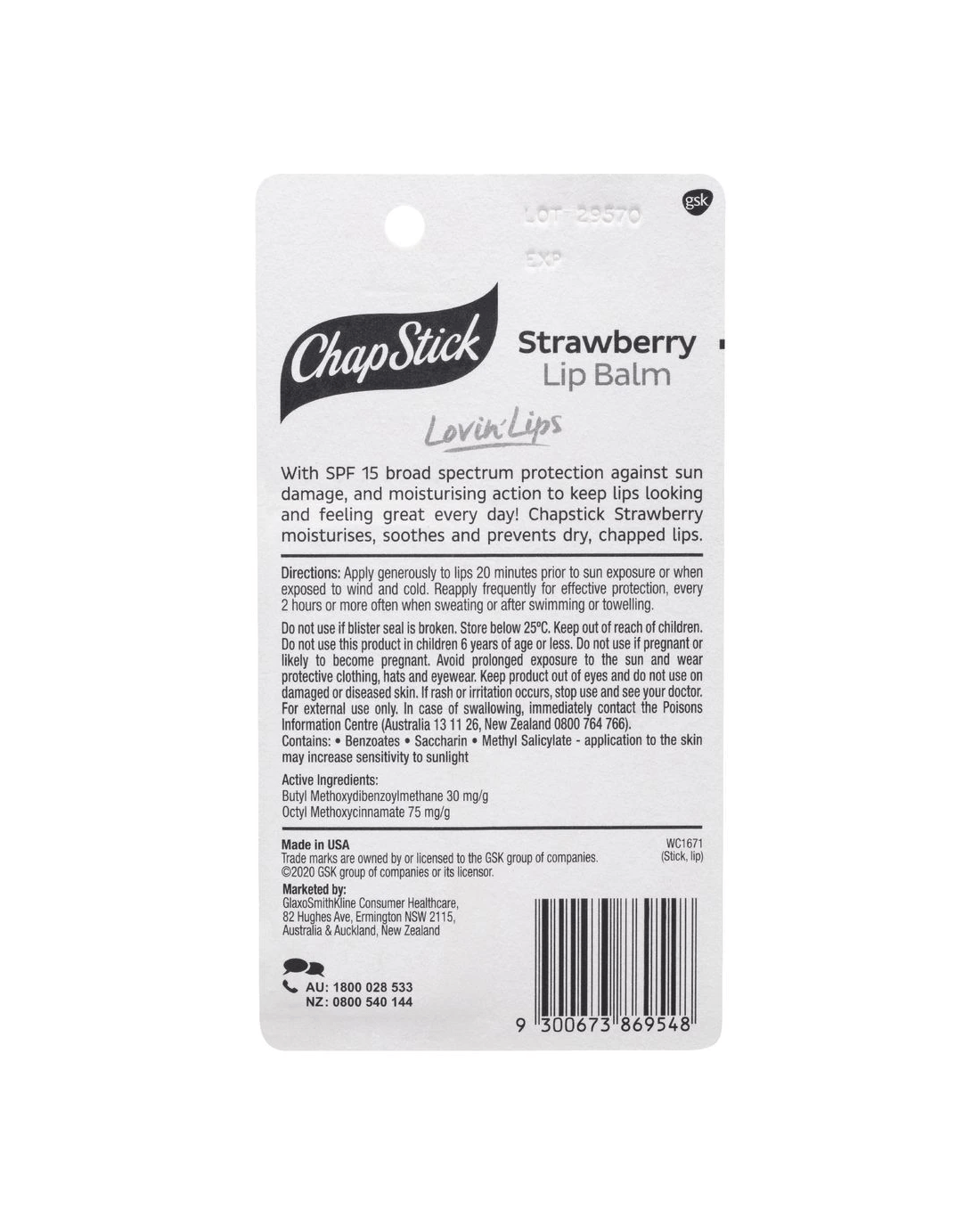This Chapstick Lip Balm offers SPF 15+ broad spectrum protection against sun damage and moisturising action to keep your lips feeling great. It soothes and helps prevent dry, chapped lips. It's perfect for storing in your handbag or car to take with you on the go, and features a pleasant strawberry scent.