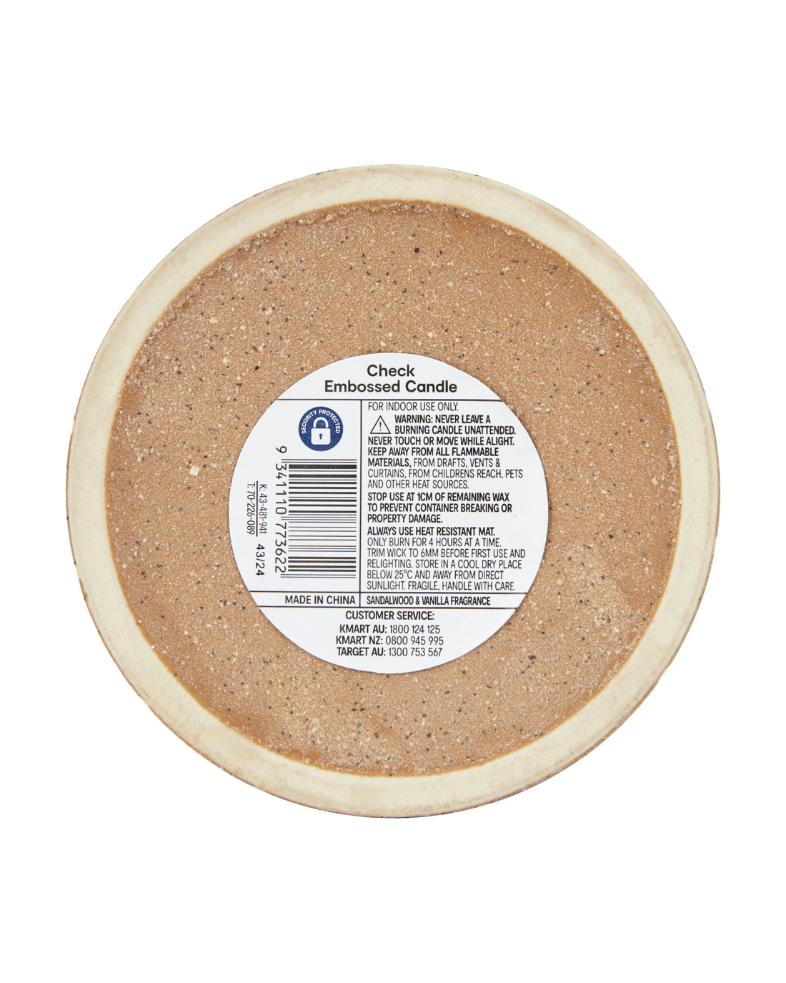The Check Embossed Candle features a beautiful textured design and fills your space with the warm, comforting scent of sandalwood and vanilla. It creates a calming ambience, perfect for any room.