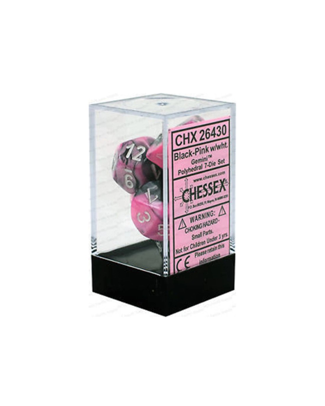 Chessex Gemini Polyhedral 7-Die Dice Set (Black/Pink & White) Includes: 1 x D4 1 x D6 1 x D8 1 x D10 Percentile 1 x D10 00-90 1 x D12 1 x D20
