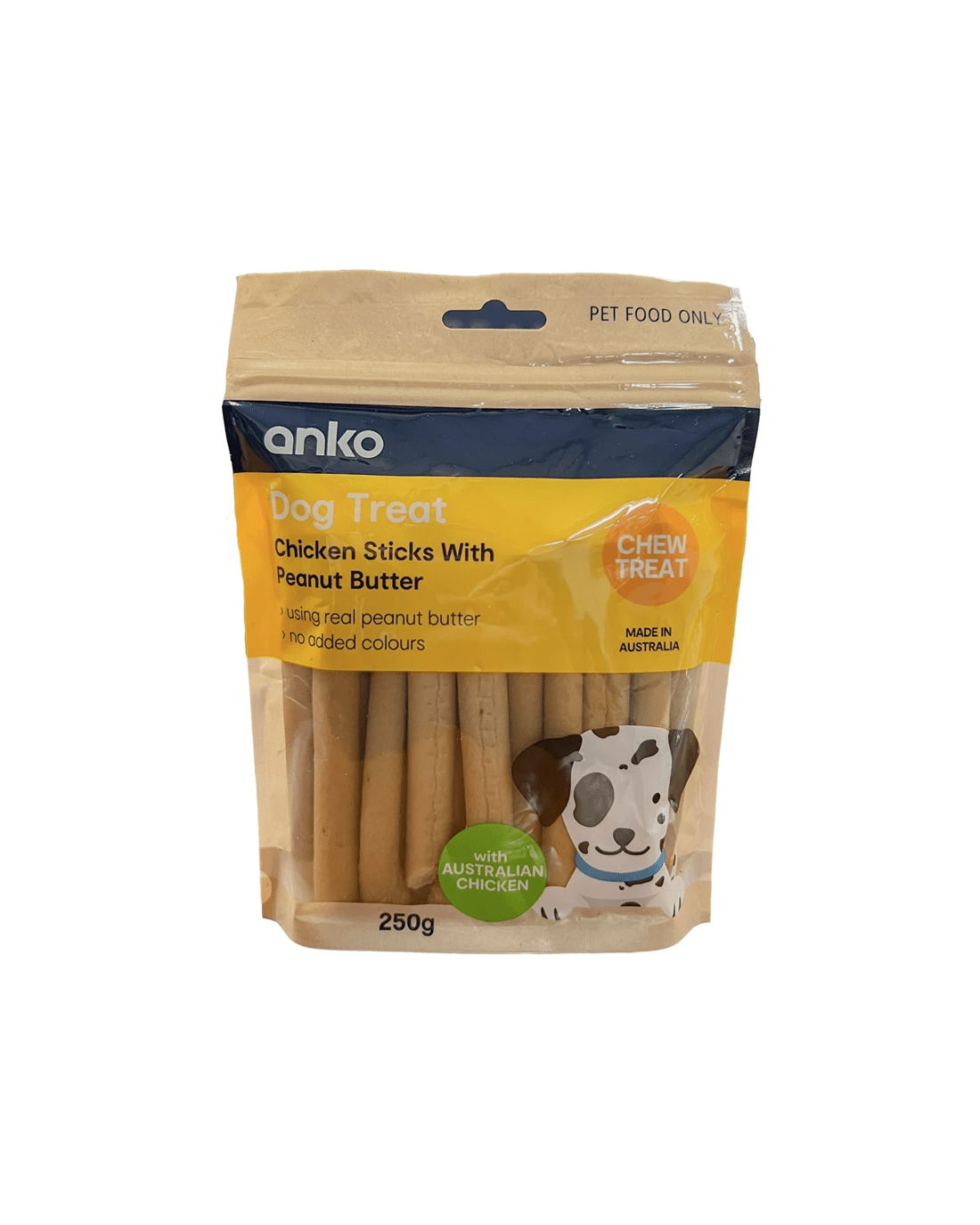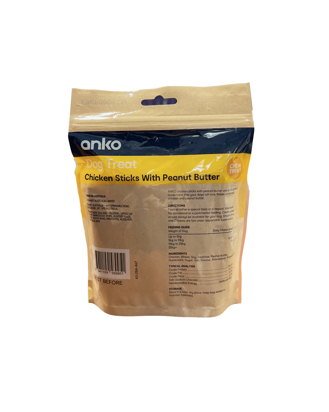 - Ingredients: Chicken, Wheat, Dextrose, Peanut Butter, Humectant, Sugar, Salt, Flavours, Antioxidant, Preservatives