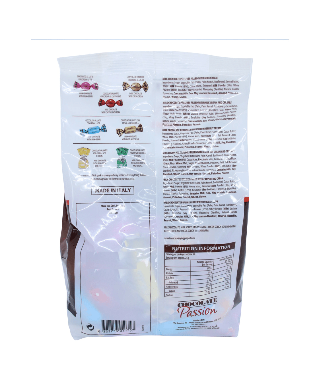 - Milk Chocolate Pralines Filled With Hazelnut Cream and Cereals: Sugar, Vegetable Fats (Palm, Palm Kernel, Sunflower), Cocoa Butter, Whole Milk Powder (8%), Cocoa Mass, Hazelnuts (4%), Cereals (4%) (Rice Flour, Wheat Flour, Wheat Malt, Sugar, Wheat Gluten, Dextrose, Salt), Fat Reduced Cocoa Powder, Skimmed Milk Powder, Whey Powder (Milk), Emulsifier (Soy Lecithin), Flavouring (Vanillin), Natural Vanilla Flavouring.