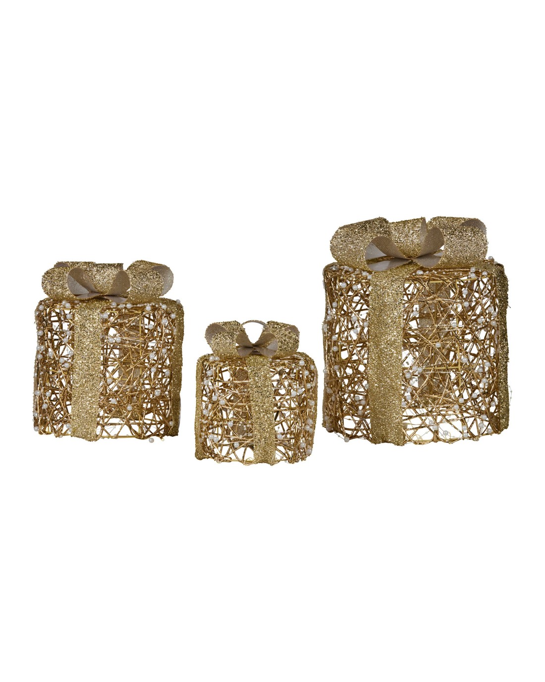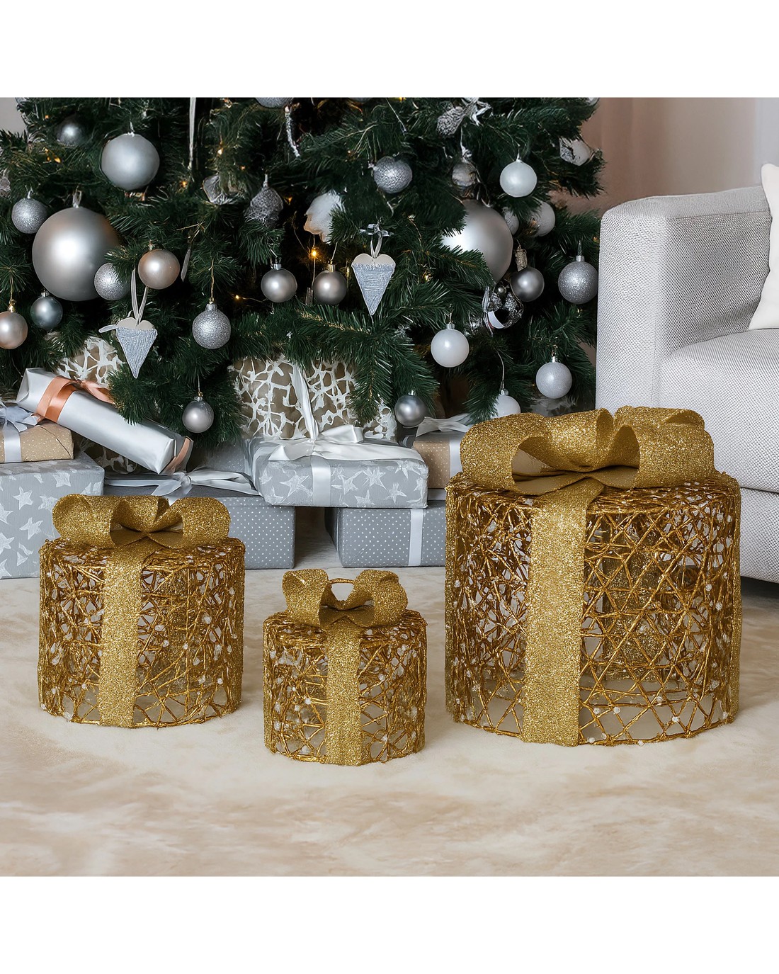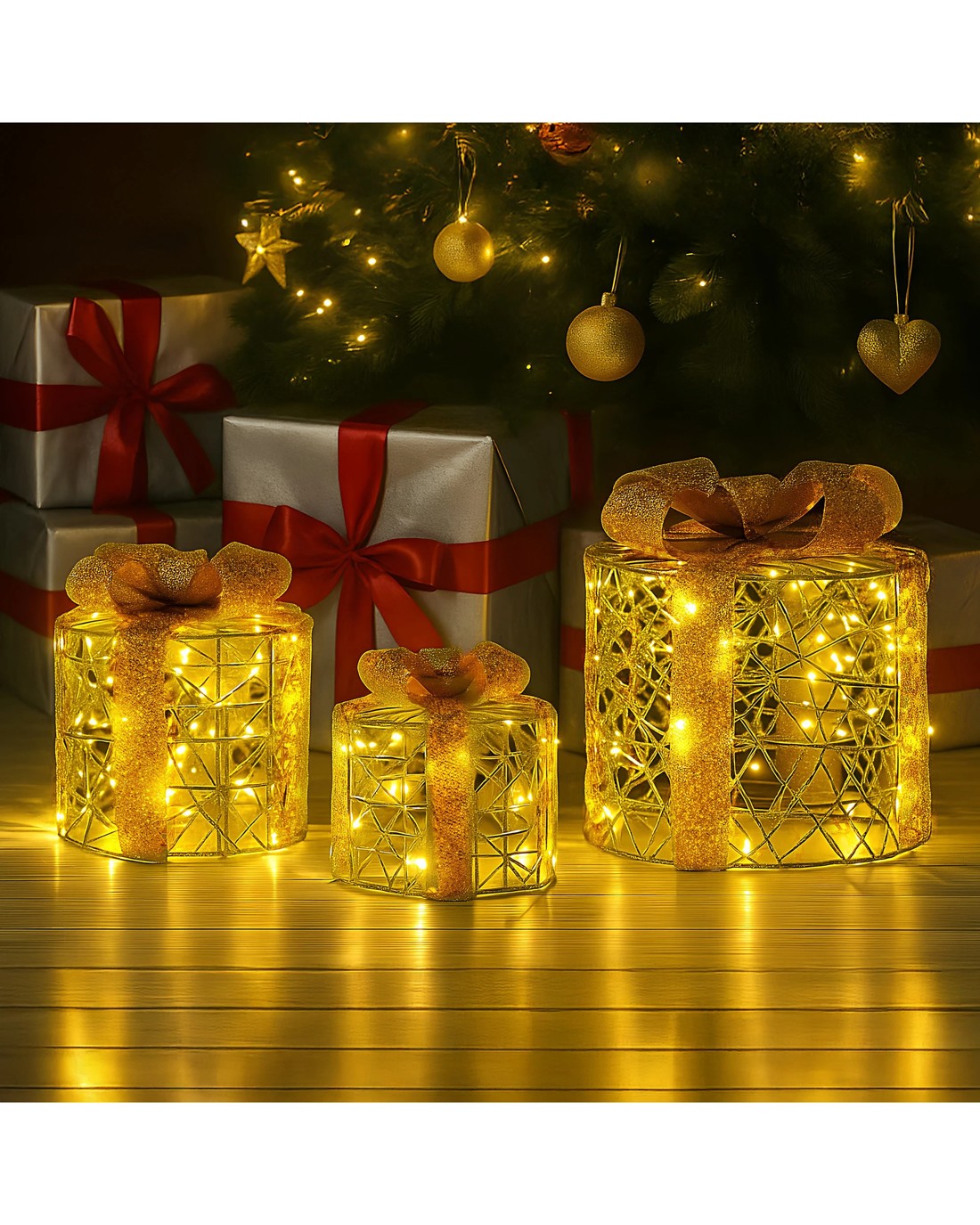 Christabelle Set Of 3 Golden Christmas Gift Boxes Led Lights Indoor Holiday Decoration Ornament