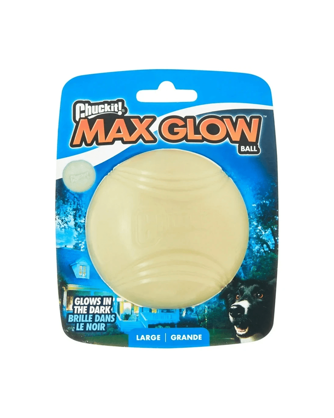 The Chuckit! Max Glow Ball in large size is a durable rubber fetch ball designed for dogs weighing 60-100 lbs. It features a photo-luminescent material that glows in the dark, allowing for extended play even after the sun goes down. The ball is highly rated for its durability and ability to recharge quickly under bright light.