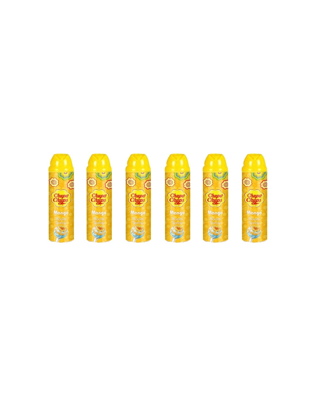 The Chupa Chups 6PK Room Spray Air Freshener is designed for freshening up your home with a delightful mango scent. This pack of six 300ml cans offers an easy way to infuse your living space with a sweet, inviting aroma, making your environment feel more welcoming and pleasant.