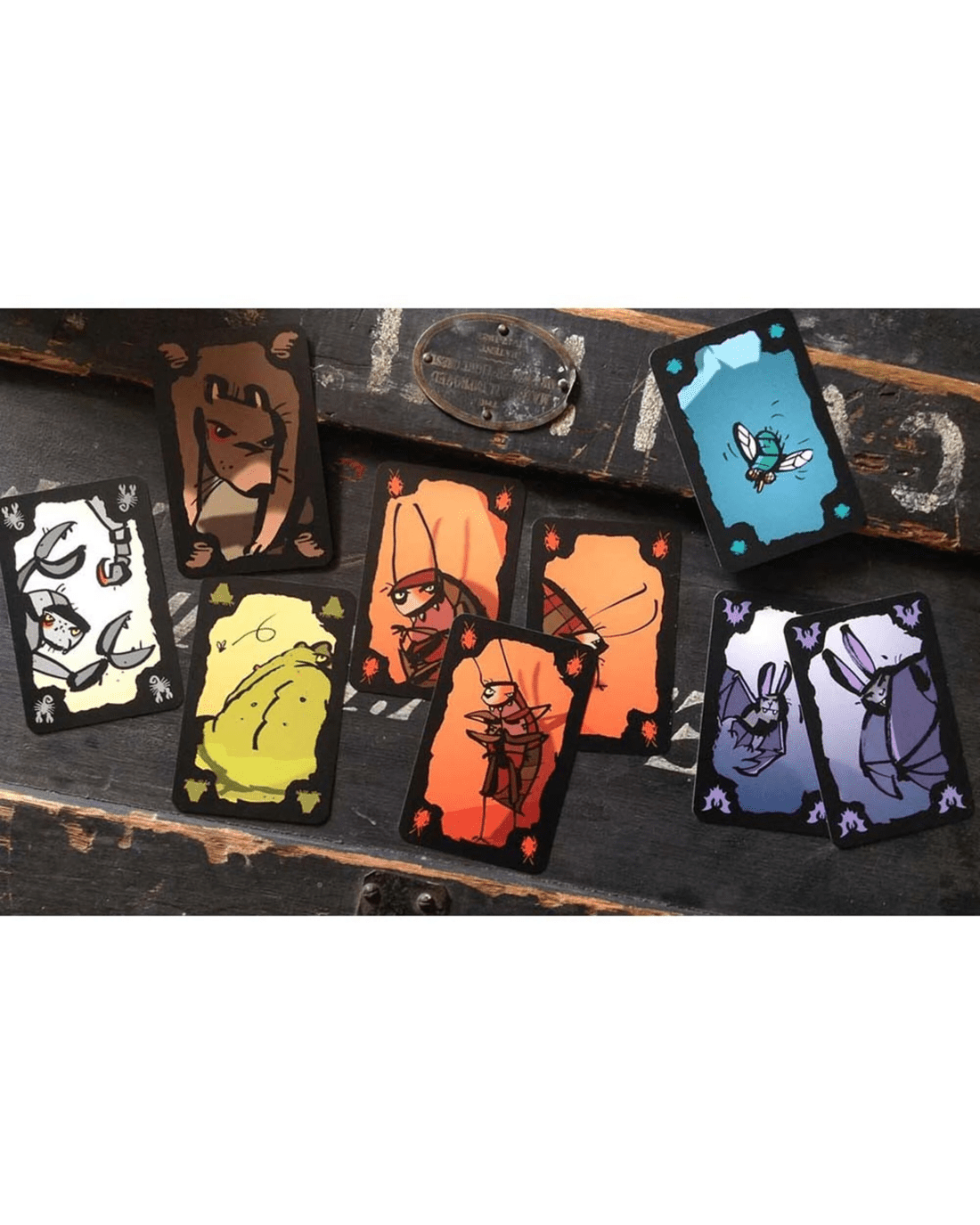 As in its parent game Cockroach Poker, Cockroach Poker Royal has nothing to do with poker - except that the game is all about bluffing, but with cards showing cockroaches, rats and stink bugs instead of queens, 10s and aces. To set up the game, shuffle the deck and deal the cards out to players. On a turn, a player takes one card from his hand, lays it face down on the table, slides it to a player of his choice, and declares a type of critter, e.g., "Stink bug". The player receiving the card either: