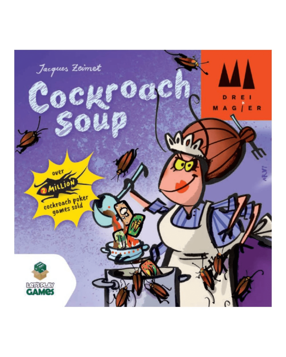 If he plays a taboo card, which shows a cockroach slurping from a spoon, he must slurp and the next player starts a new pile next to the first one so that the taboo card remains visible. If his vegetable matches a visible taboo card, he must slurp - unless the last person who played such a card slurped, in which case he must say, "Mmmm". Make a mistake or stumble or hesitate too long, and a player must pick up all cards played to that point in the game. The first player to run out of cards wins! Can be combined with Cockroach Salad.