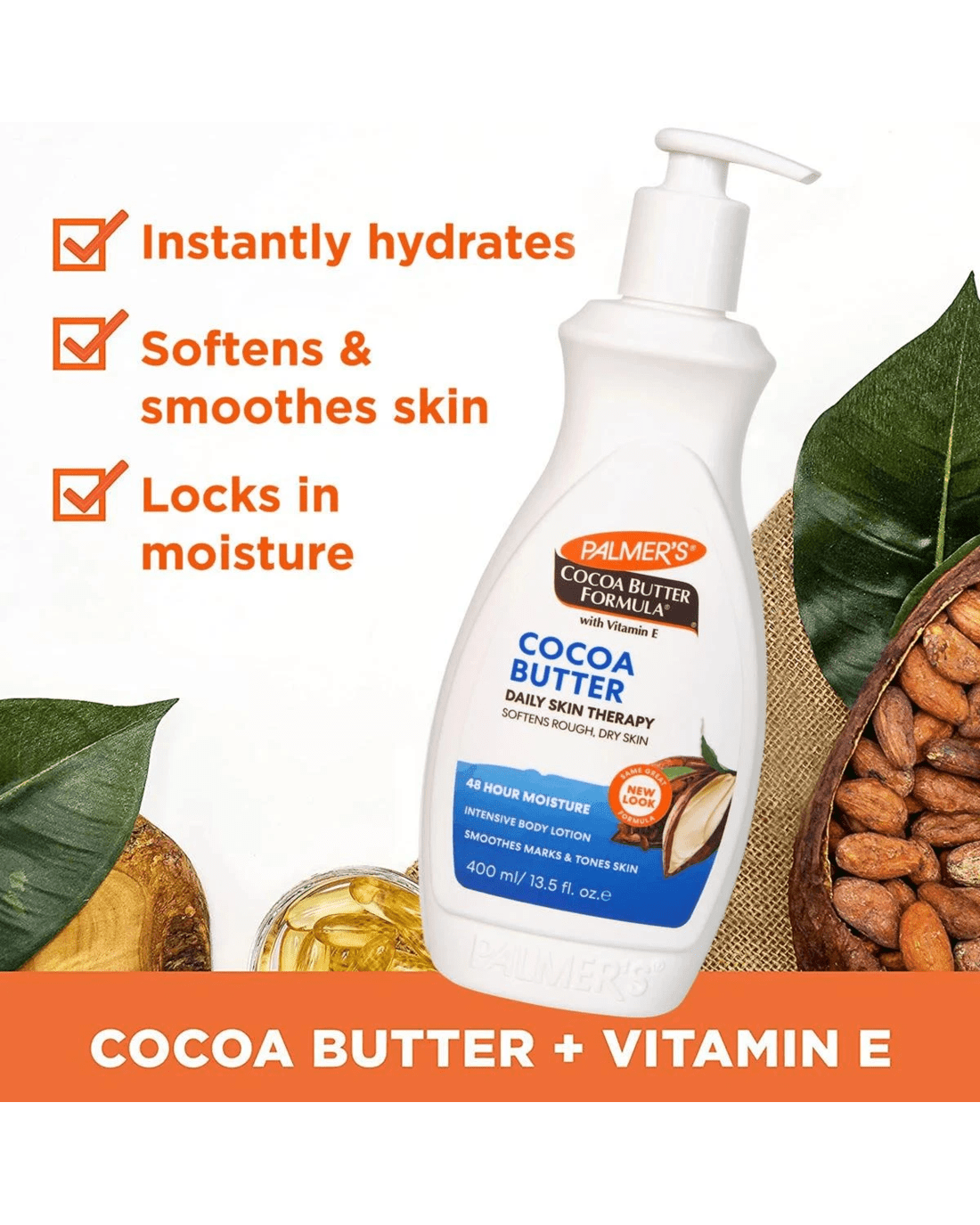 Treat your skin to lasting hydration with Palmer's Cocoa Butter Formula Body Lotion. This creamy formula, bursting with the goodness of pure cocoa butter and nourishing vitamin E, melts into the skin and helps leave it feeling soft and refreshed. Even on the driest days, you'll find your skin stays soothed and comfortable for up to 48 hours. It’s perfect for keeping your skin looking healthy, smooth, and even-toned day after day. Enjoy daily confidence in your skin’s softness and treat yourself to the comforting scent of cocoa. Discover how fabulous your skin can feel—give it the pampering it deserves today.