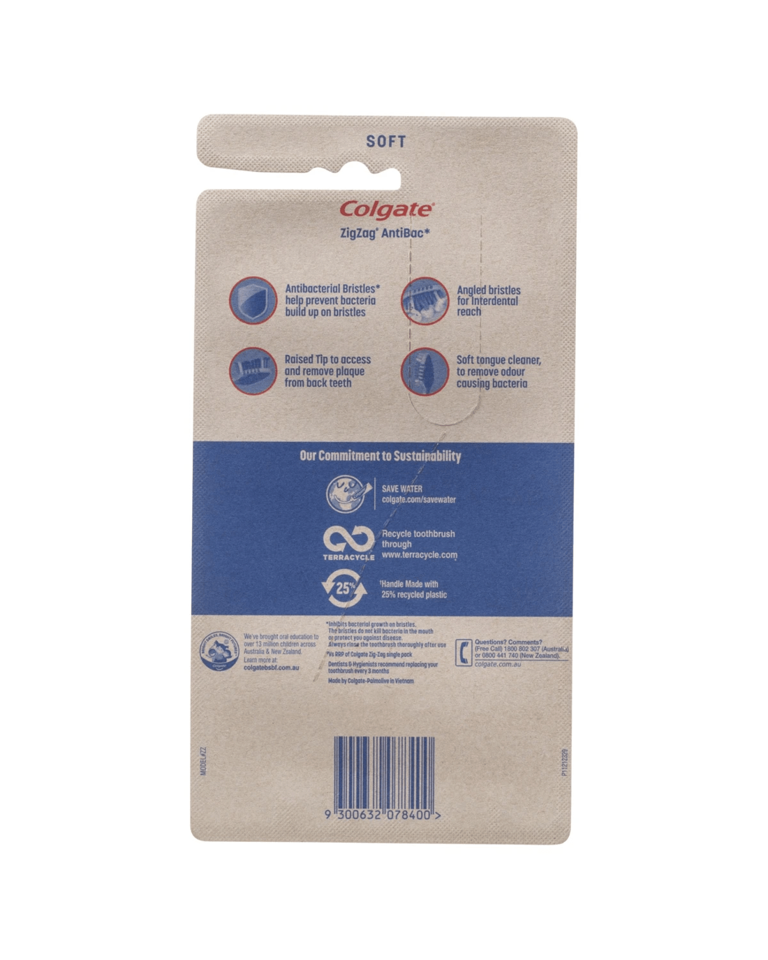 The manual toothbrush has Zig Zag Antibacterial bristles* and angled bristles for interdental reach. Also featuring a raised tip and a soft tongue cleaner, to remove odour-causing bacteria. The handle is also made with 25% post-consumer recycled plastic.