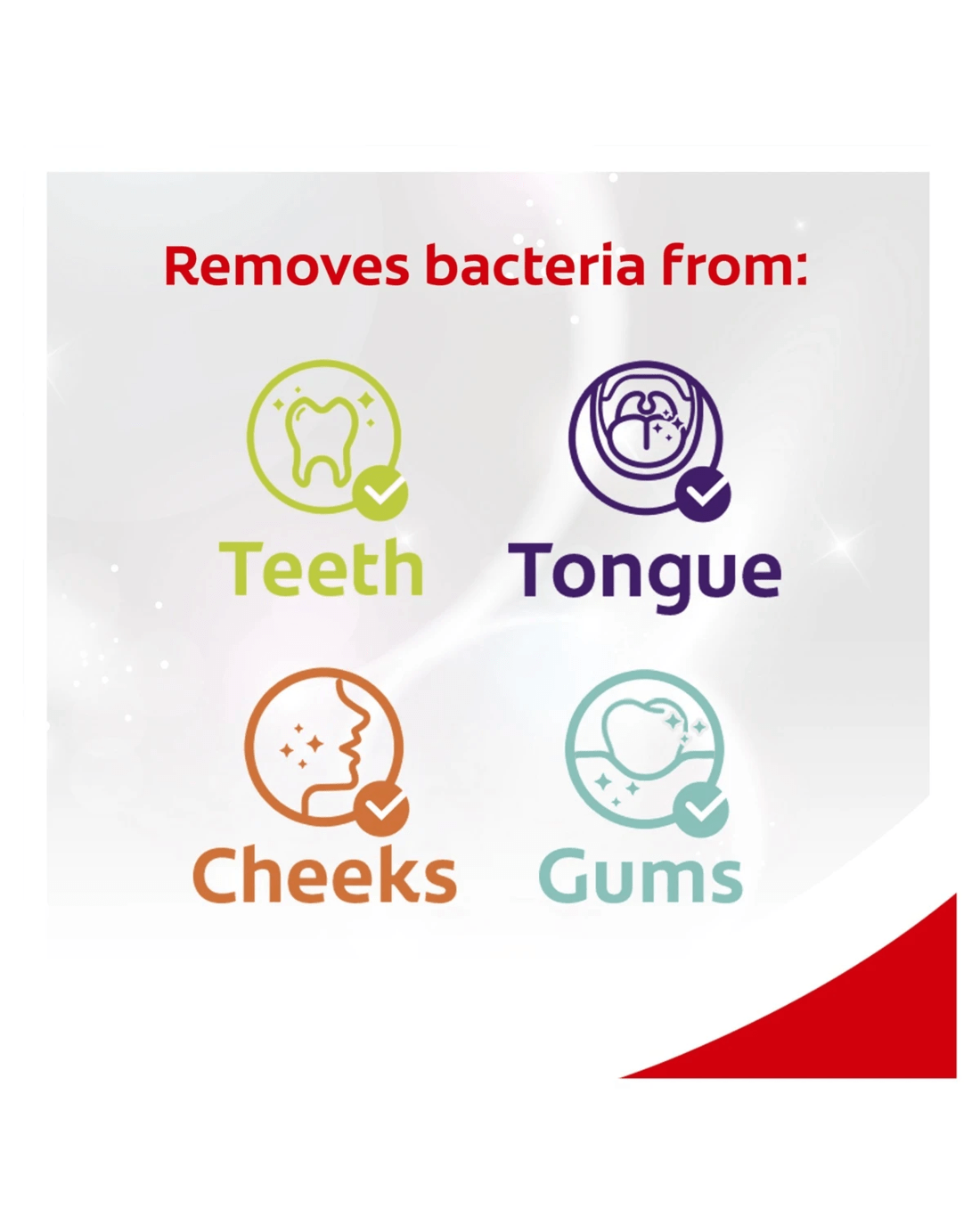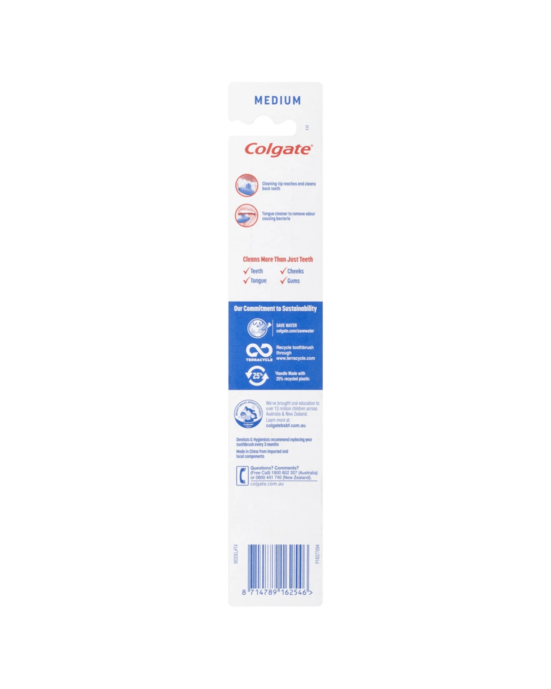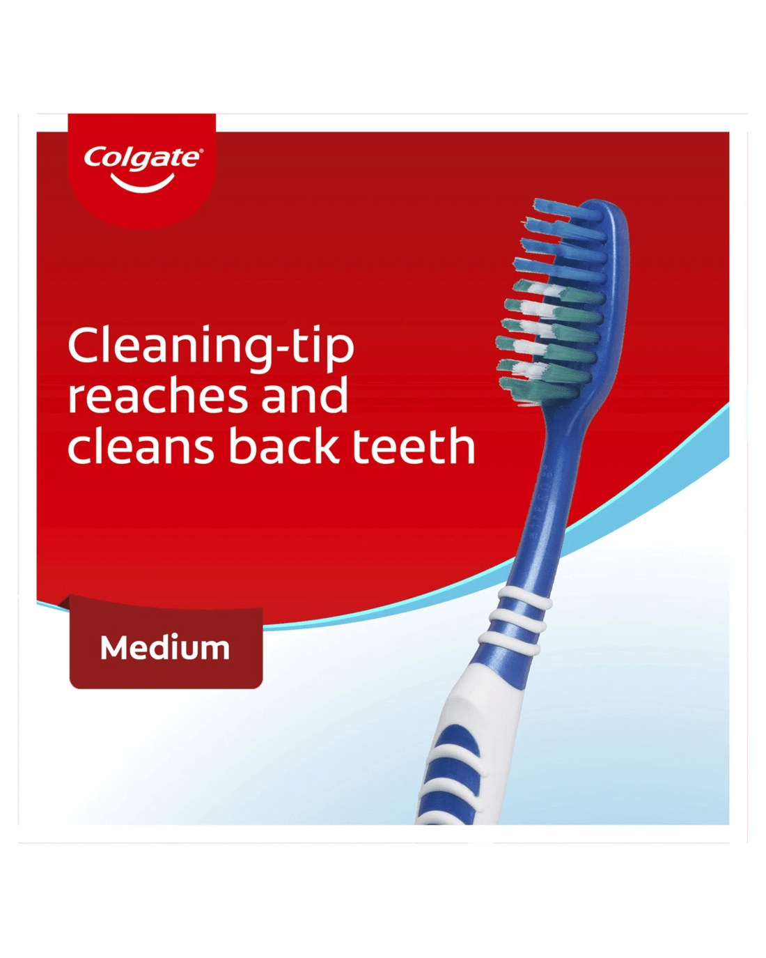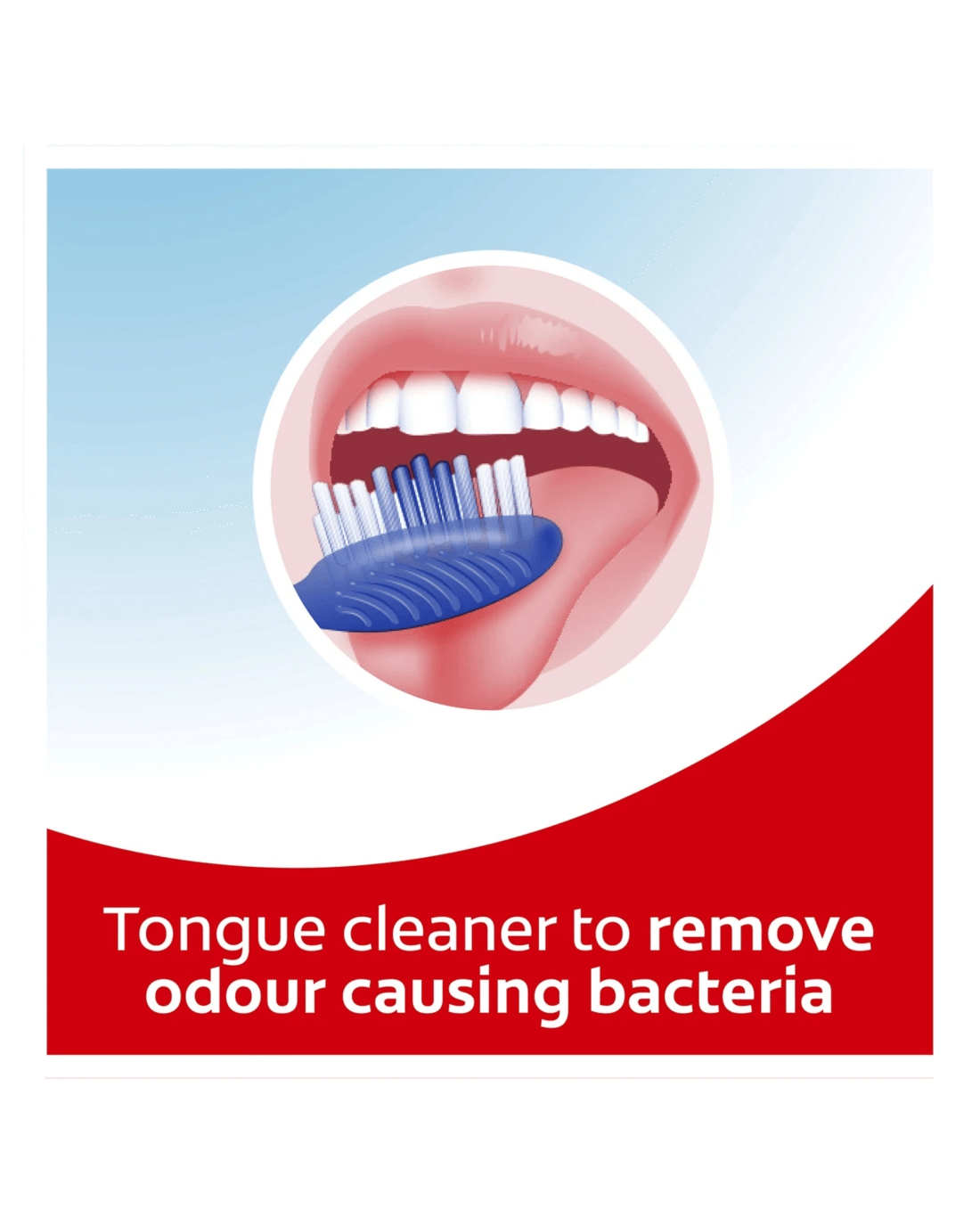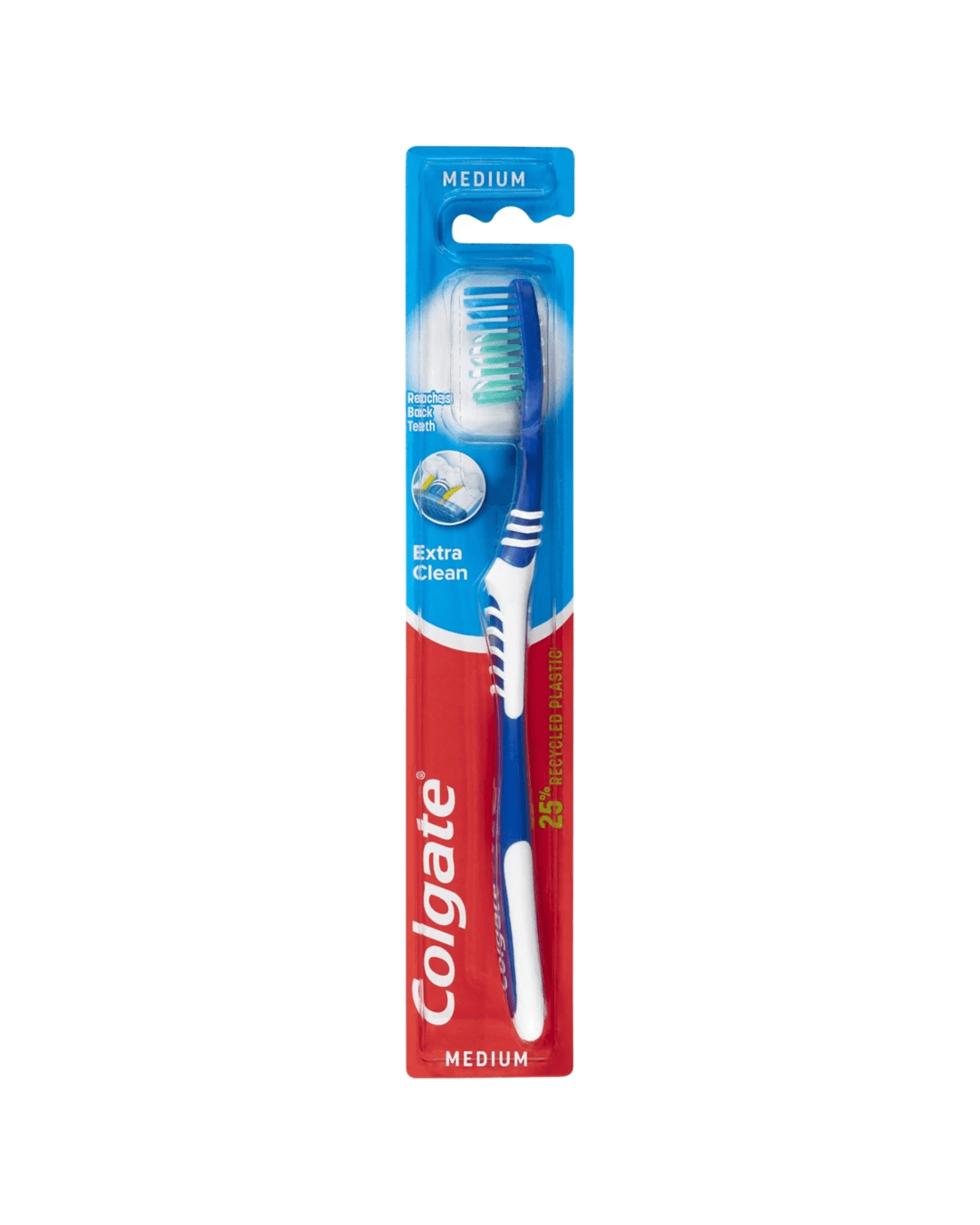 Colgate Extra Clean Toothbrush cleans and reaches back teeth. It has a cleaning-tip that reaches and cleans back teeth. It has a soft rubber tongue cleaner to gently remove odour causing bacteria.