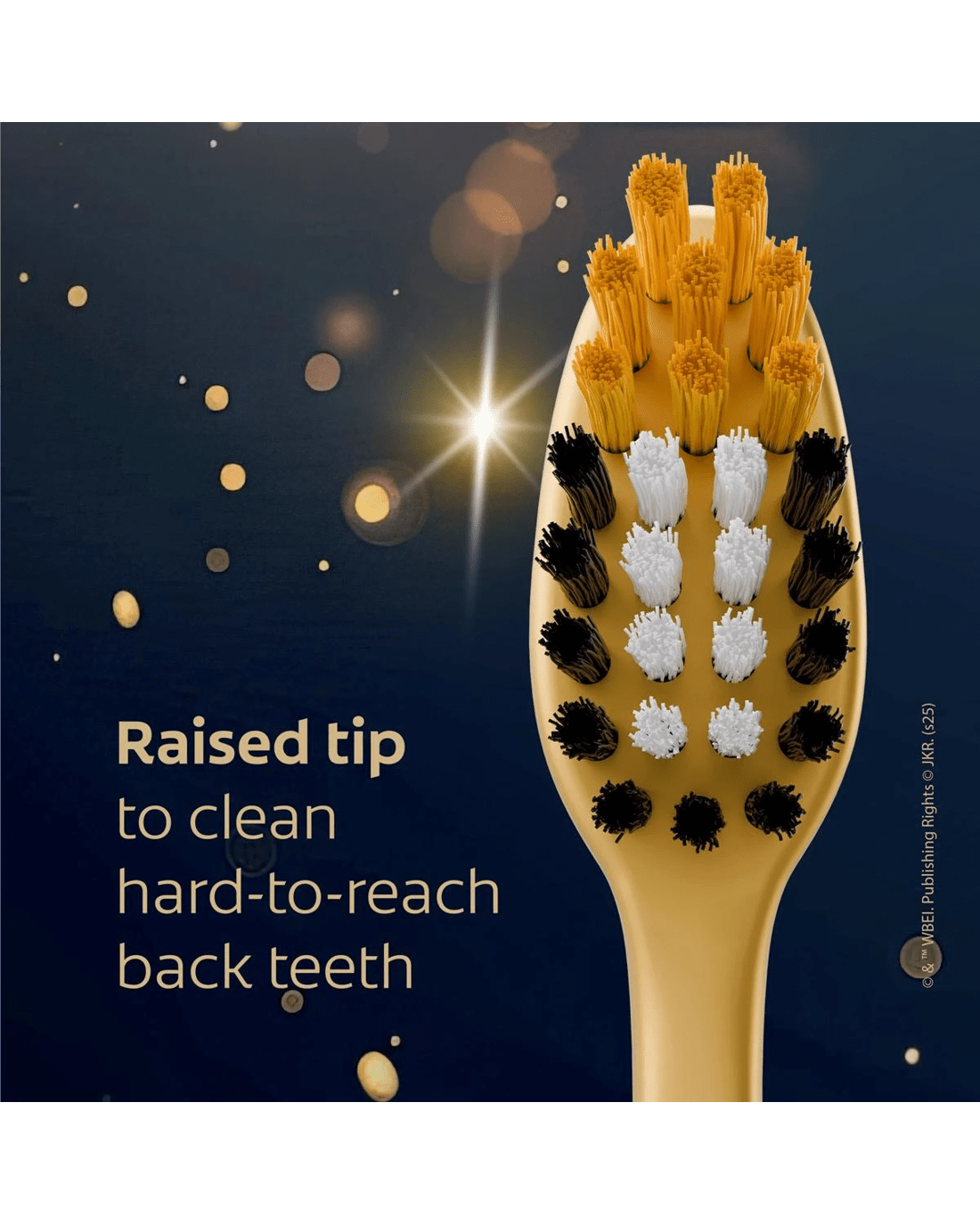 • Raised tip to clean hard-to-reach back teeth