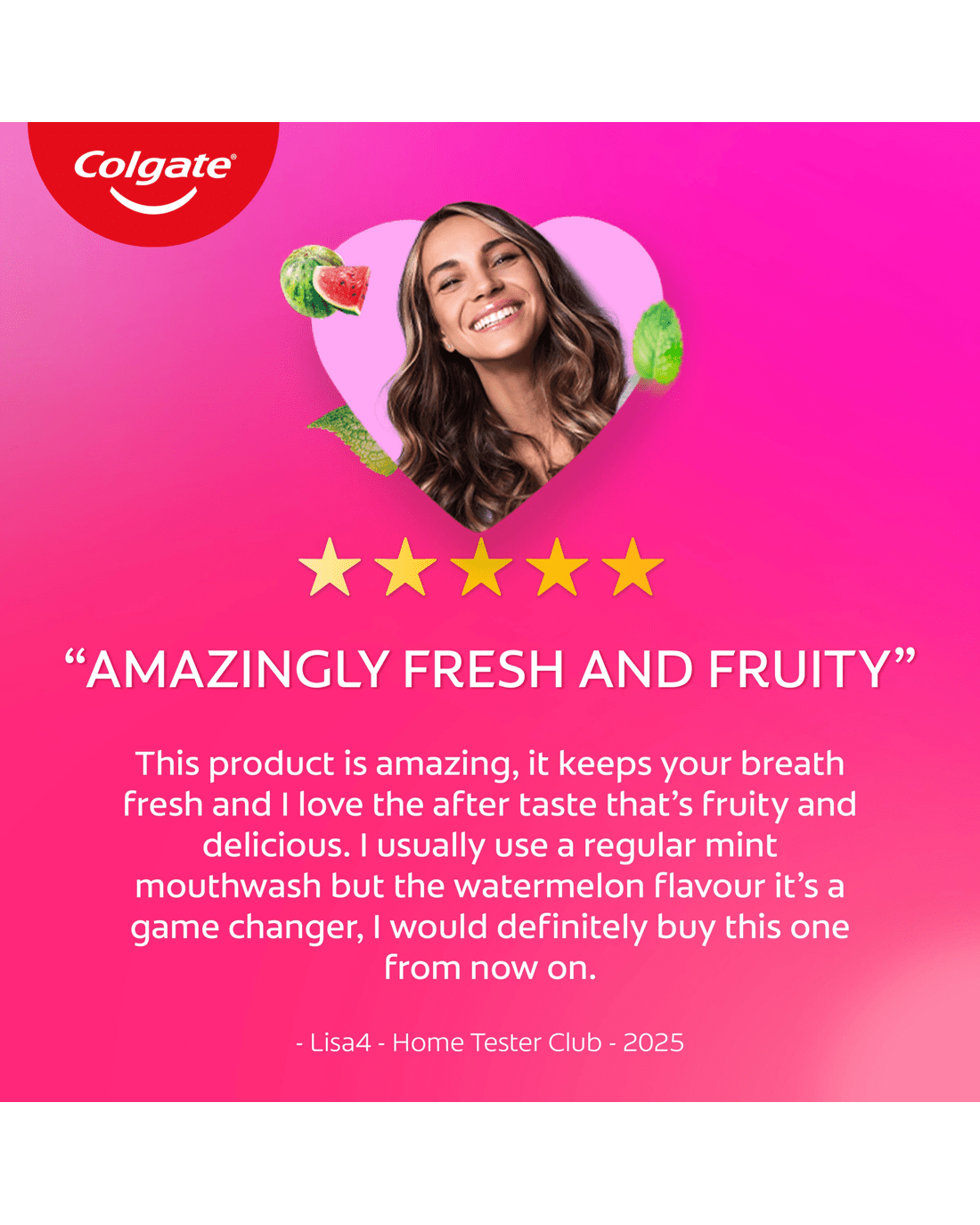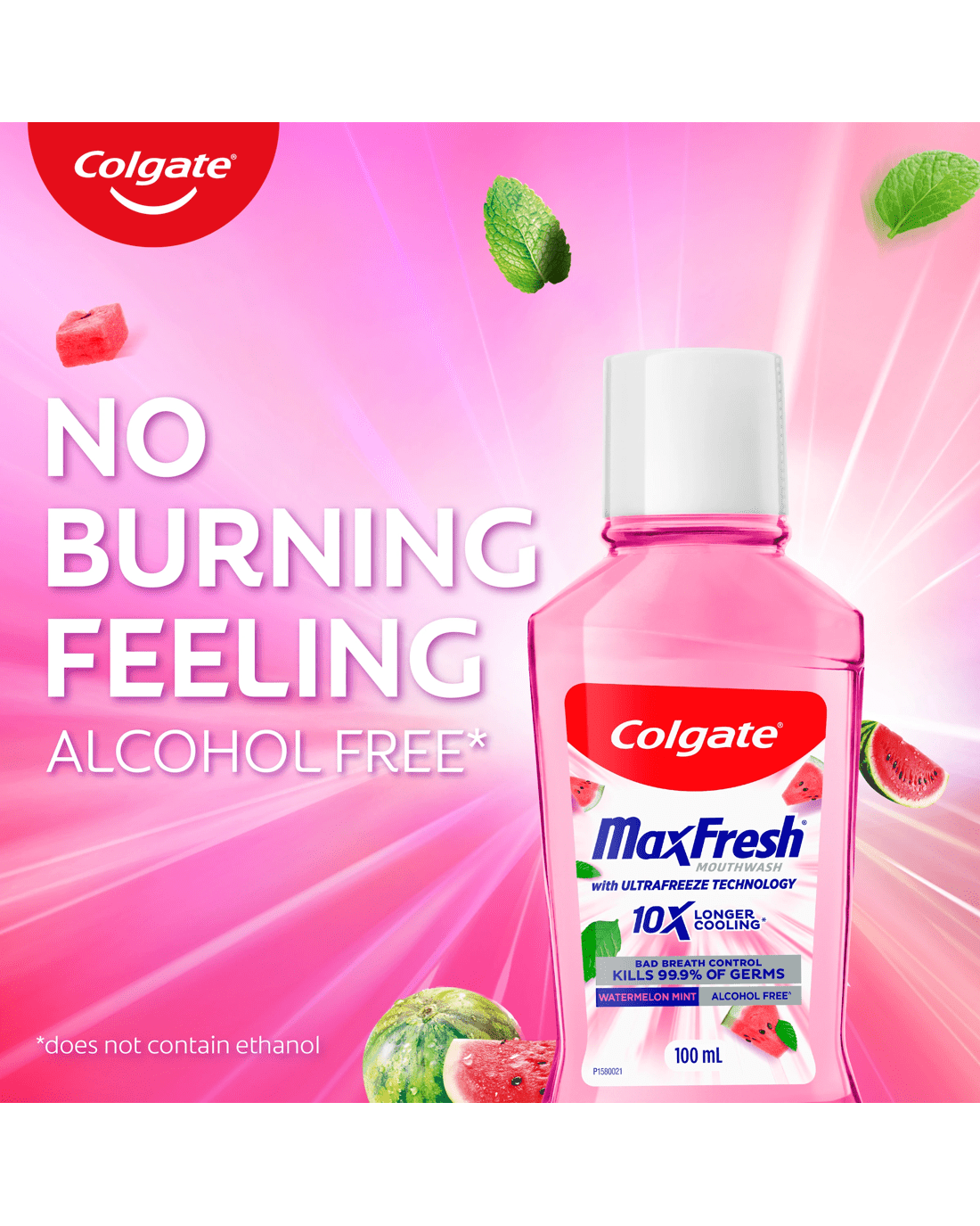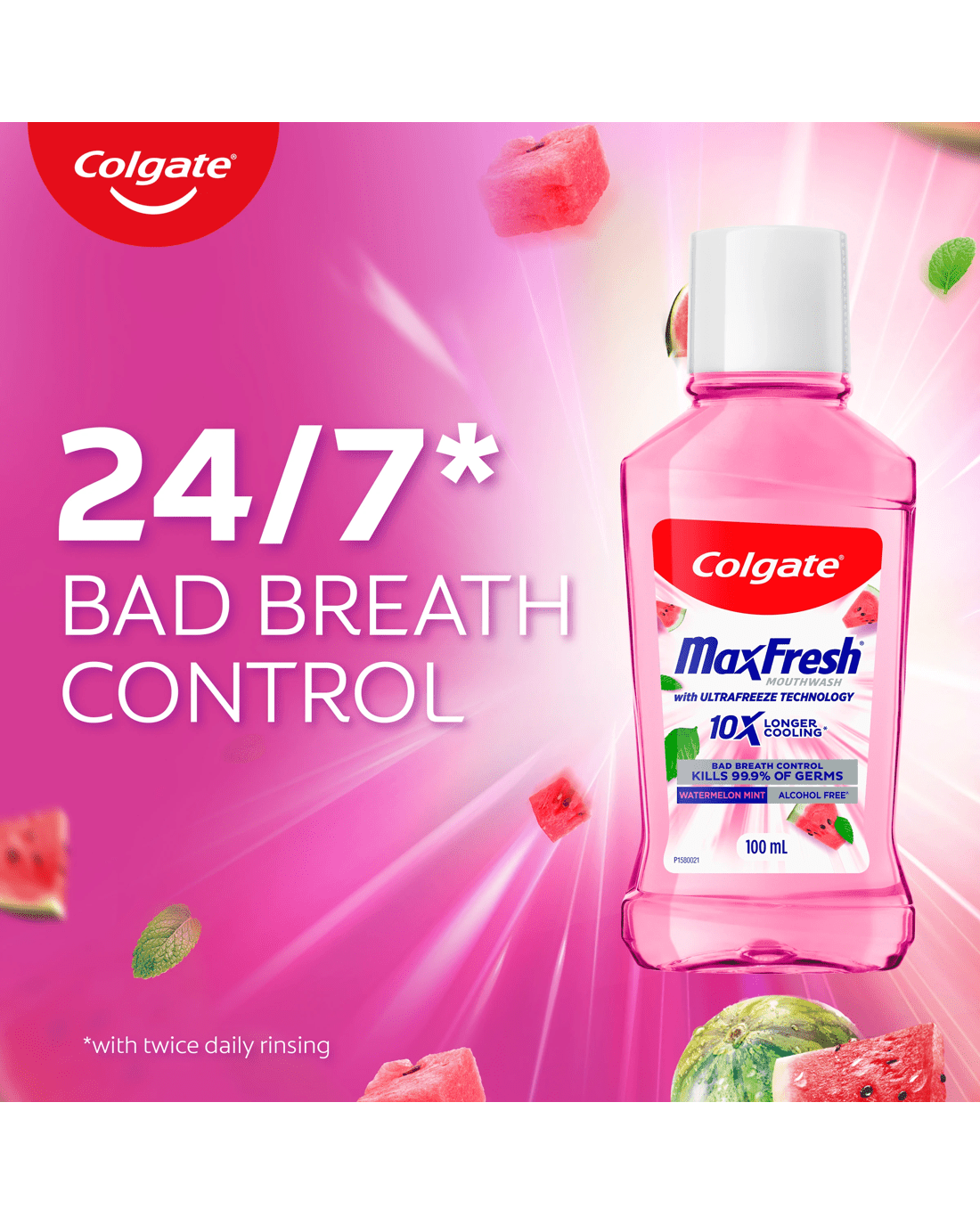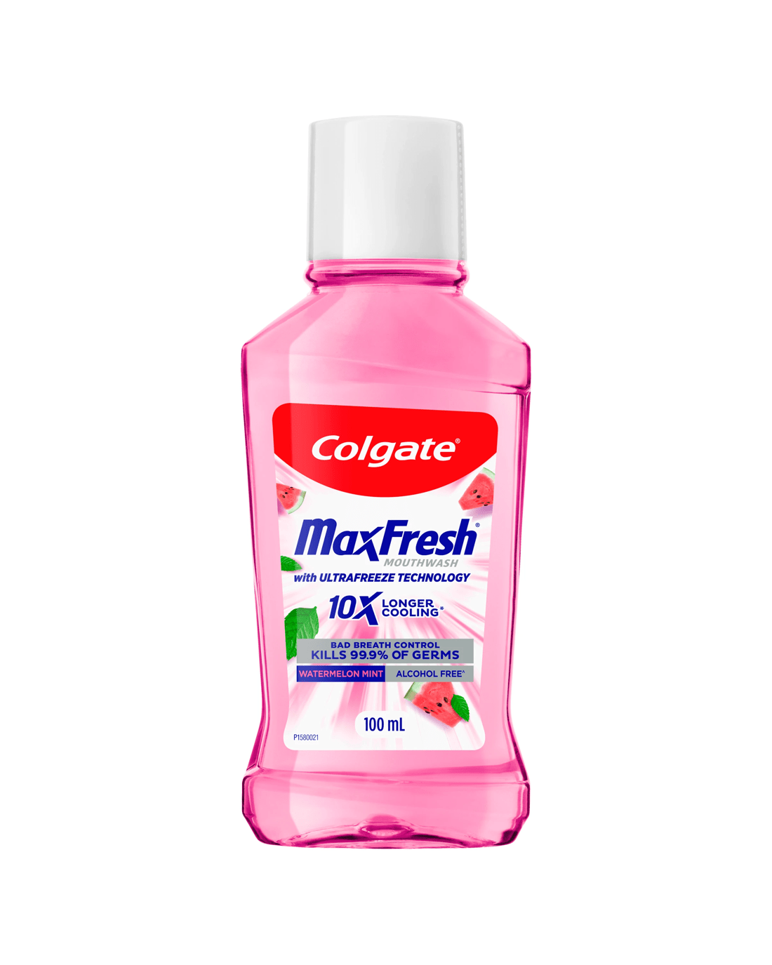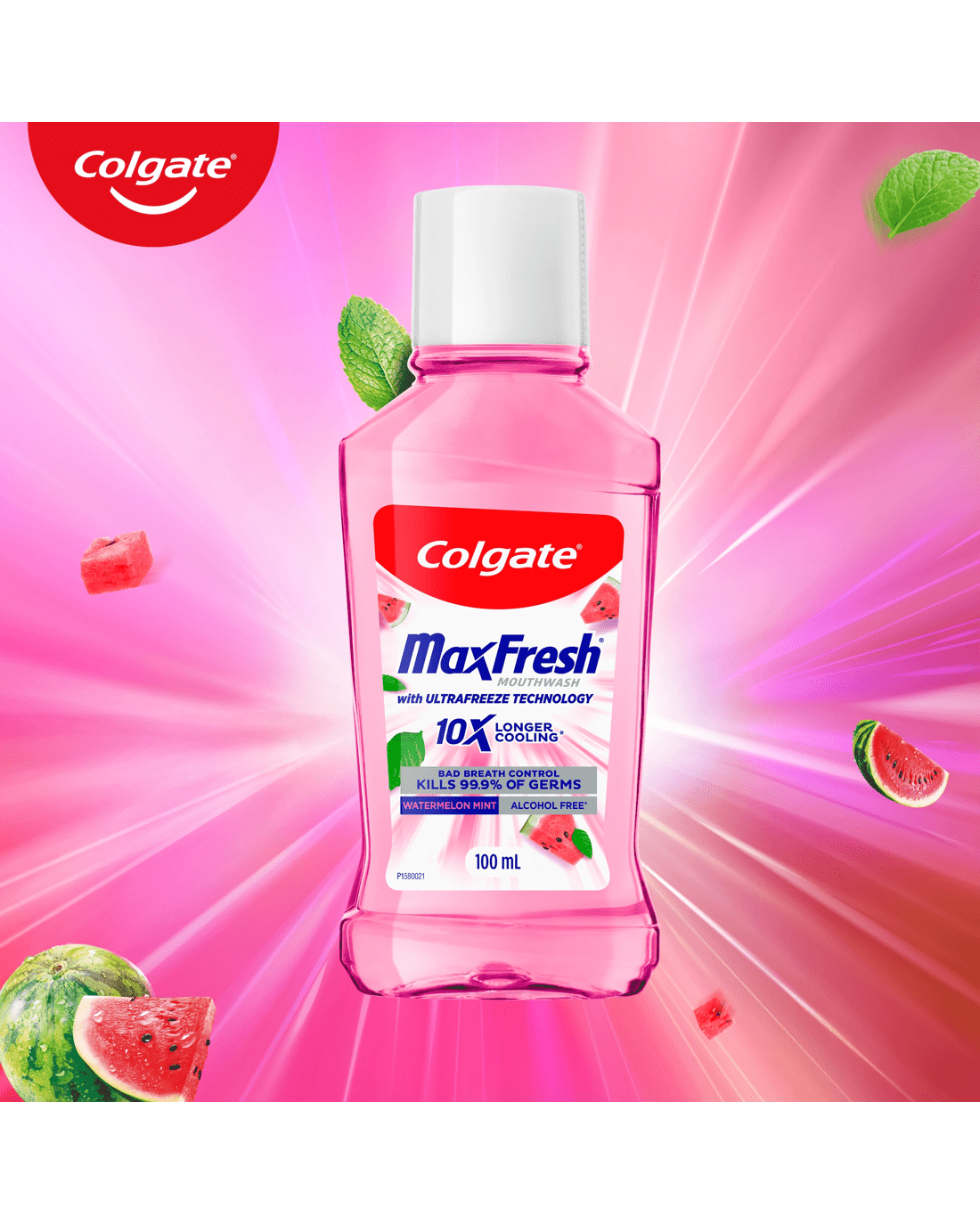 Experience a flavour explosion with Colgate MaxFresh Watermelon Mint Antibacterial Alcohol Free Fluoride Free Mouthwash, with new Ultrafreeze Technology.