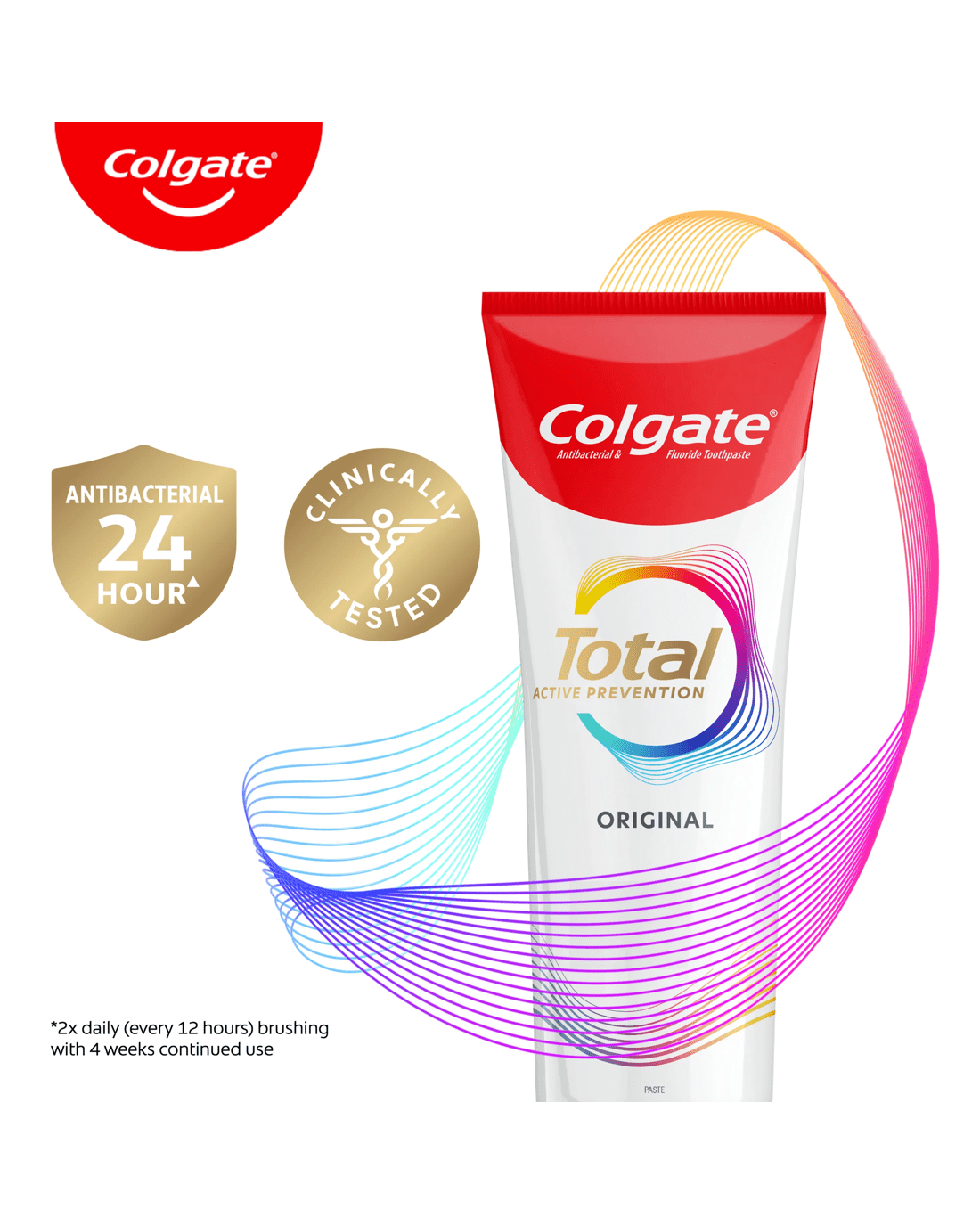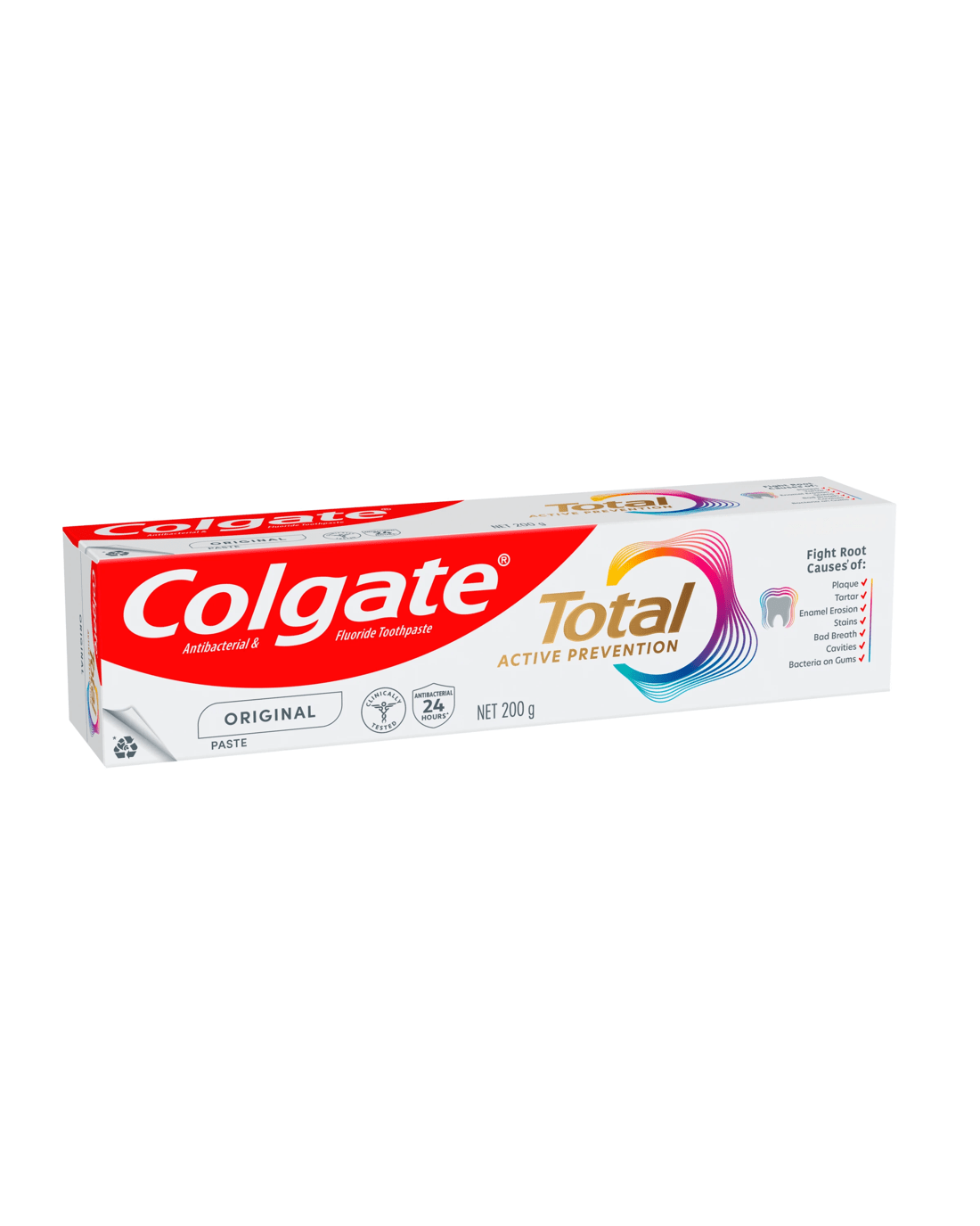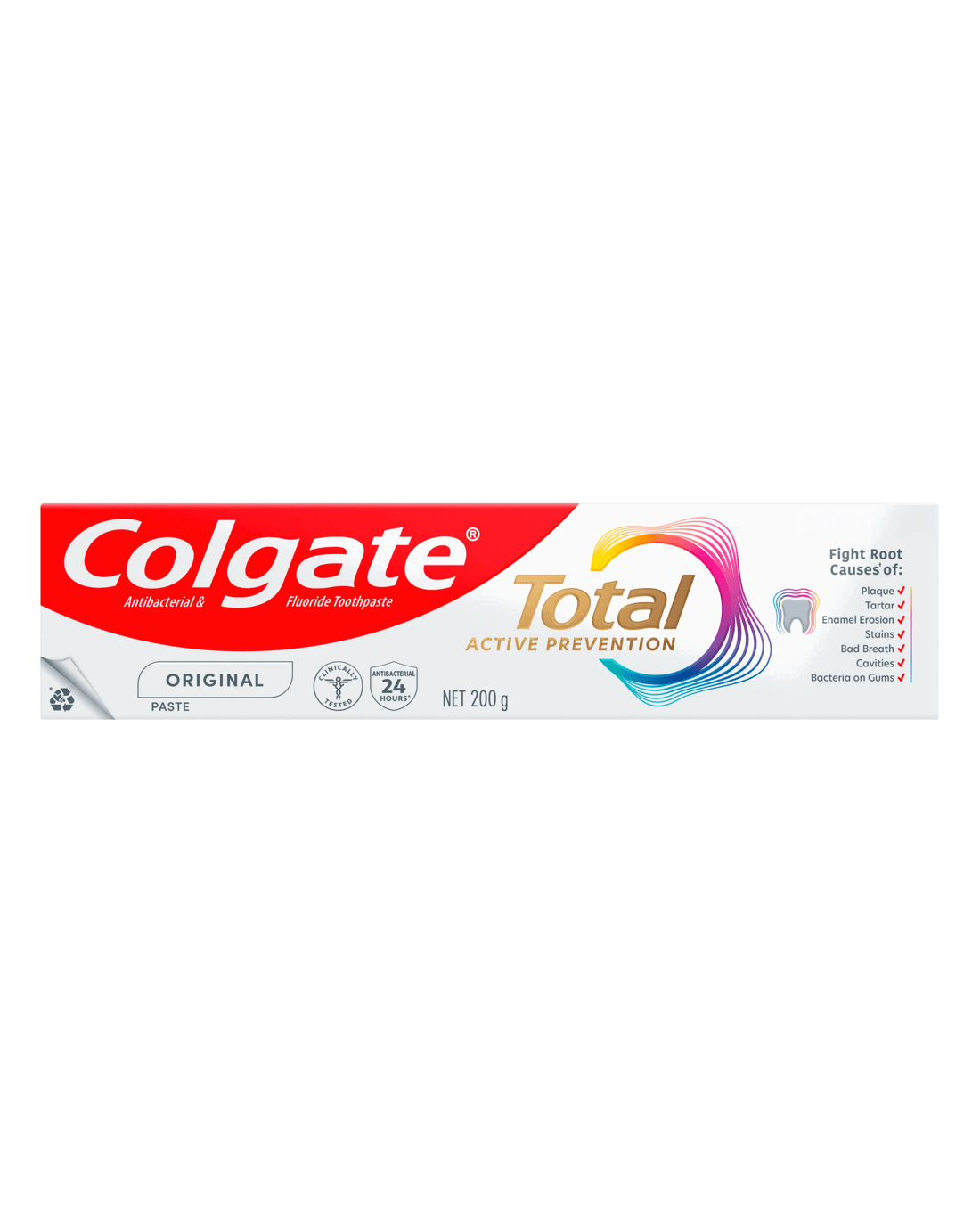 That?s why Colgate Total Original antibacterial fluoride toothpaste proactively fights bacteria not just on your teeth, but also on your tongue, cheeks and gums for 12 hours* for whole mouth health.