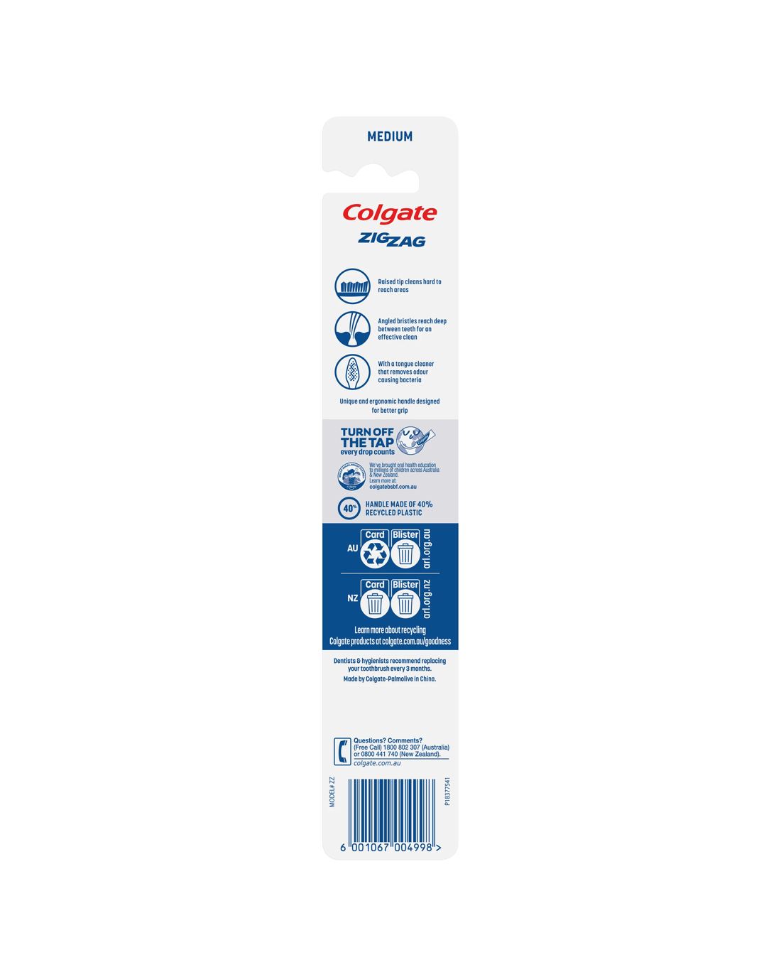 Colgate Zig Zag Medium Bristle toothbrush cleans more than just teeth, use it to clean: Teeth, cheeks, tongue and gums