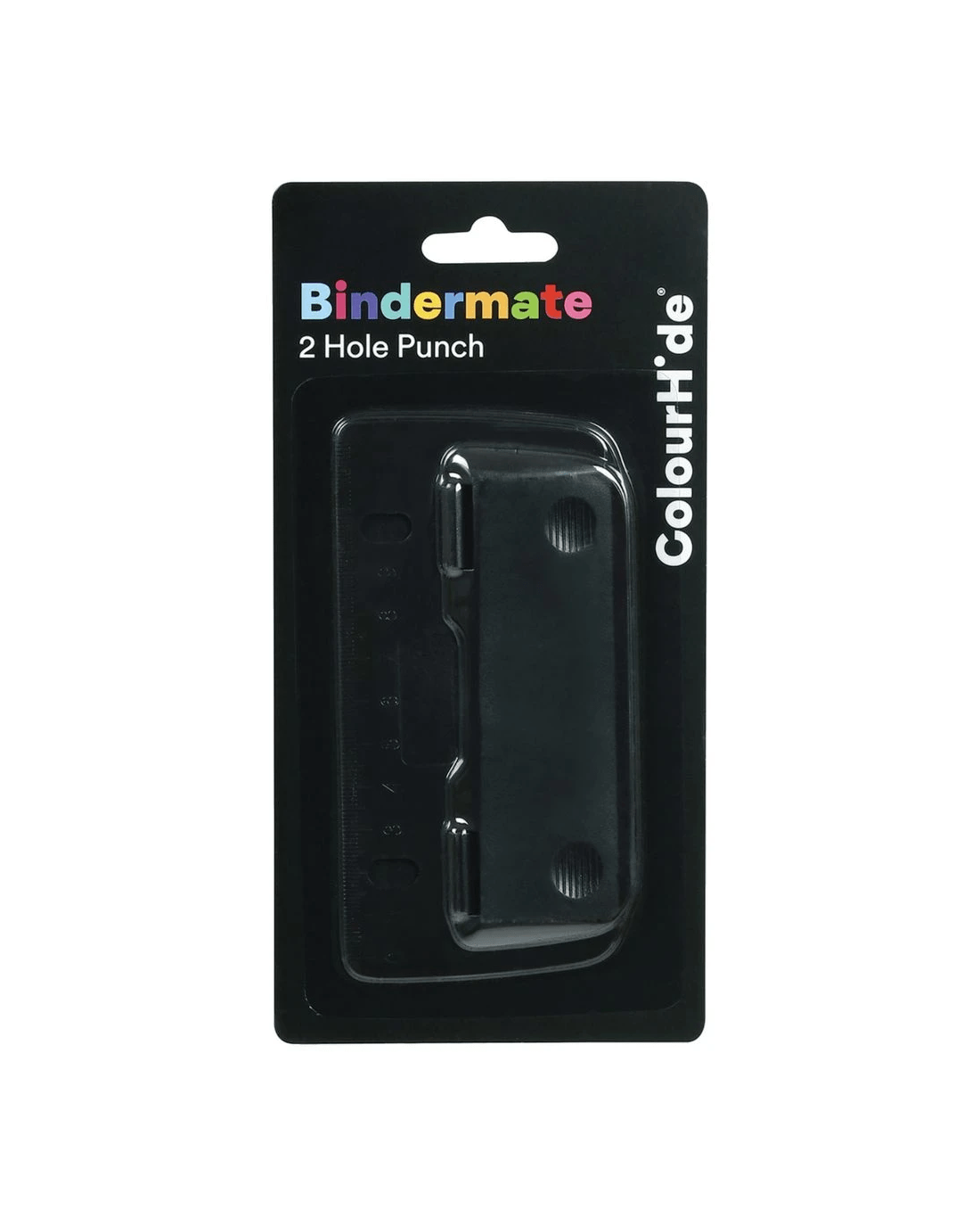 The ColourHide Bindermate 2 Hole Punch can create two holes in pages so they fit into ring binders without using plastic sleeves. It is made from ABS plastic and has its own holes punched so it can clip into binders.