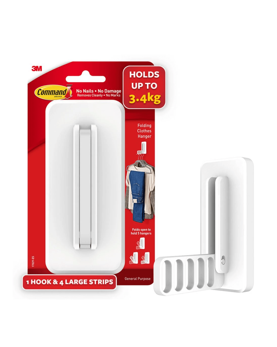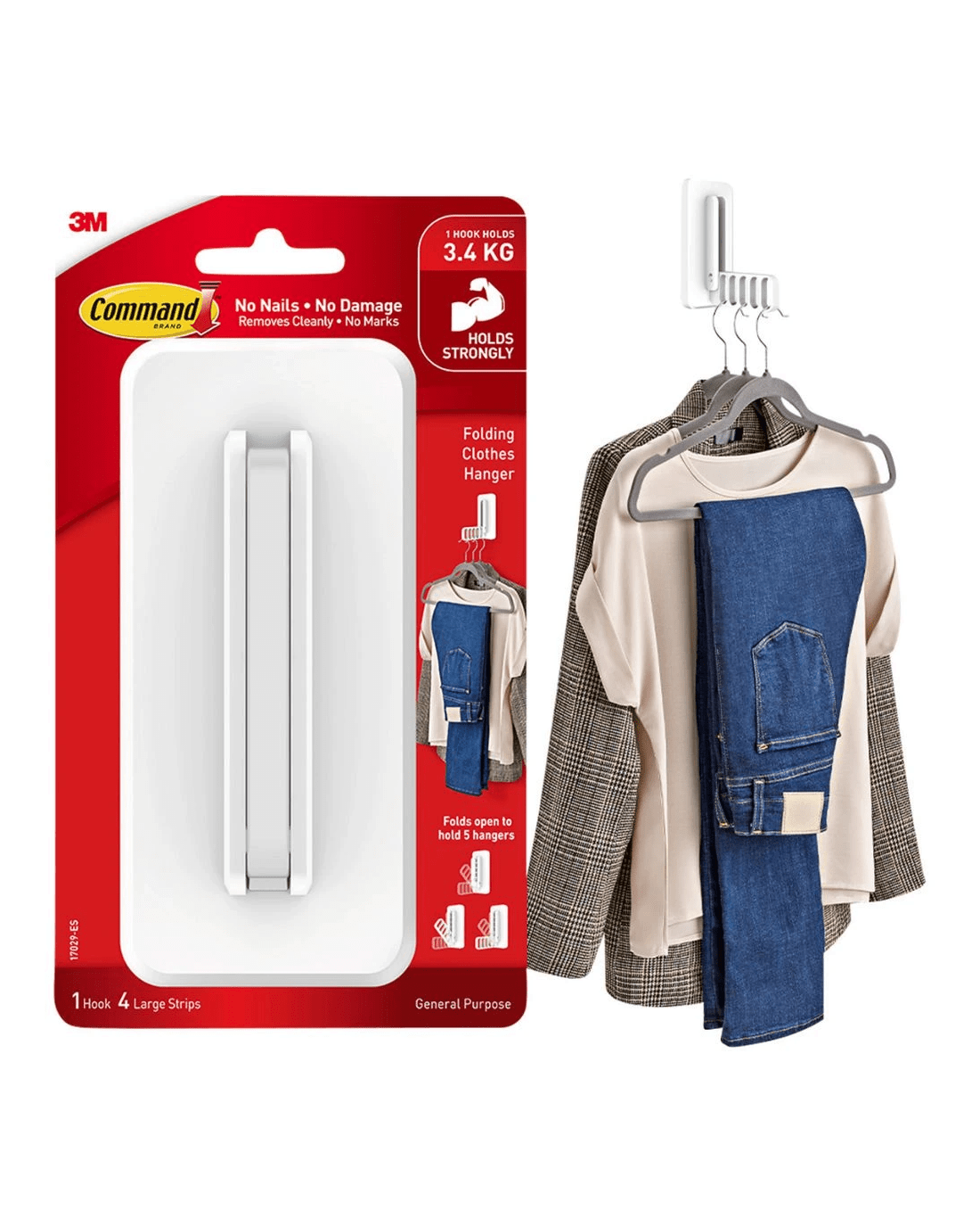 Create extra hanging space wherever you need it with this Command Folding Clothes Hanger. It folds out to hold up to five hangers and folds back when not in use, making it ideal for small spaces like closets, dorms or laundry rooms. Plus, it installs easily with adhesive strips and removes cleanly without damage.