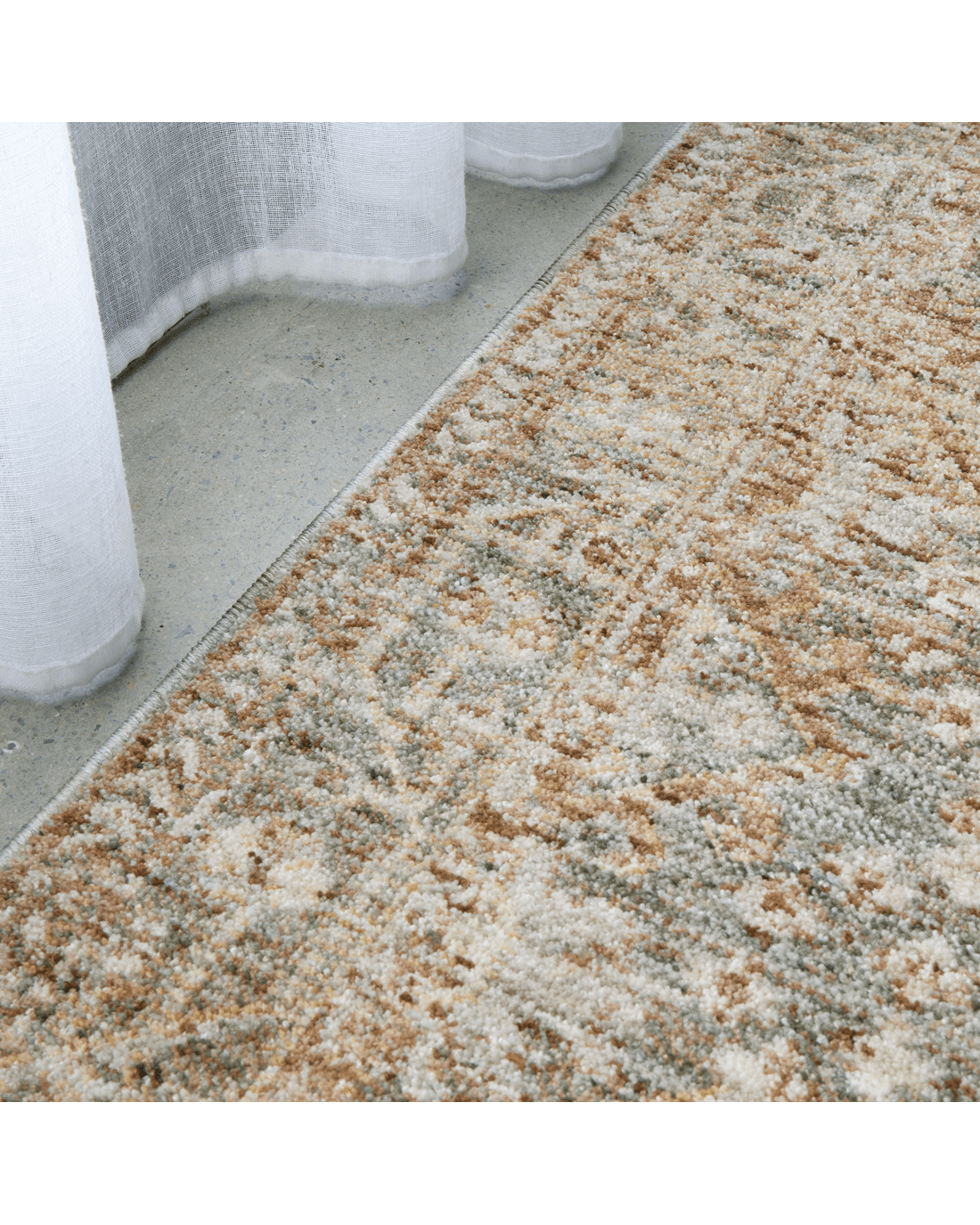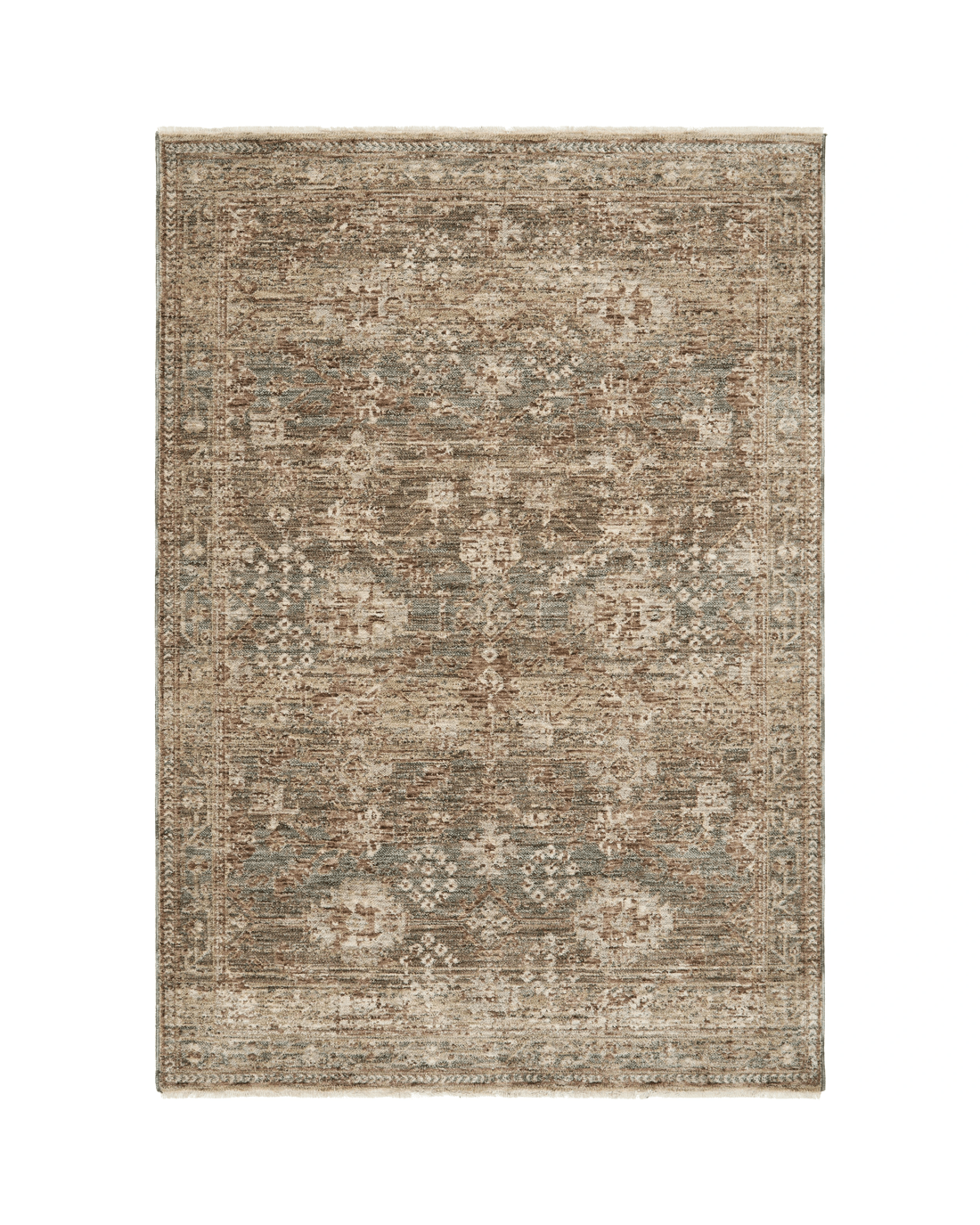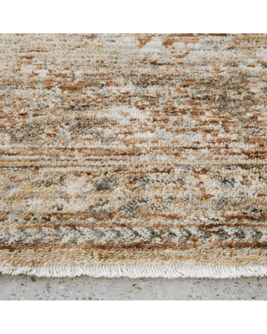 Elegant and effortlessly versatile rug features timeless traditional motifs softened in warm neutrals and faded sandstone. The subtle pattern and distress mimic the look of a vintage heirloom rug, while the neutral palette offers a light and understated presence that complements any interior.