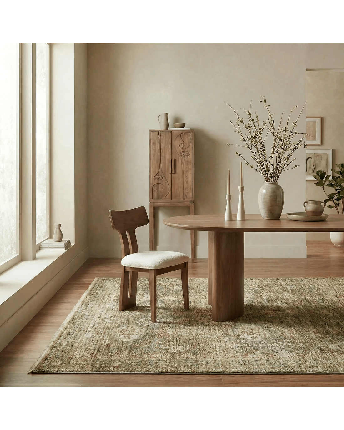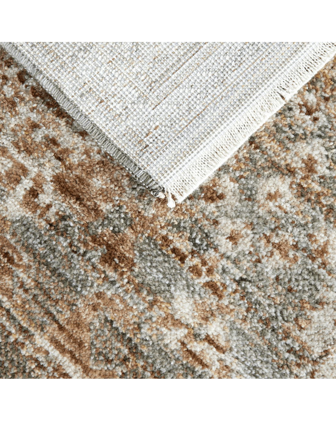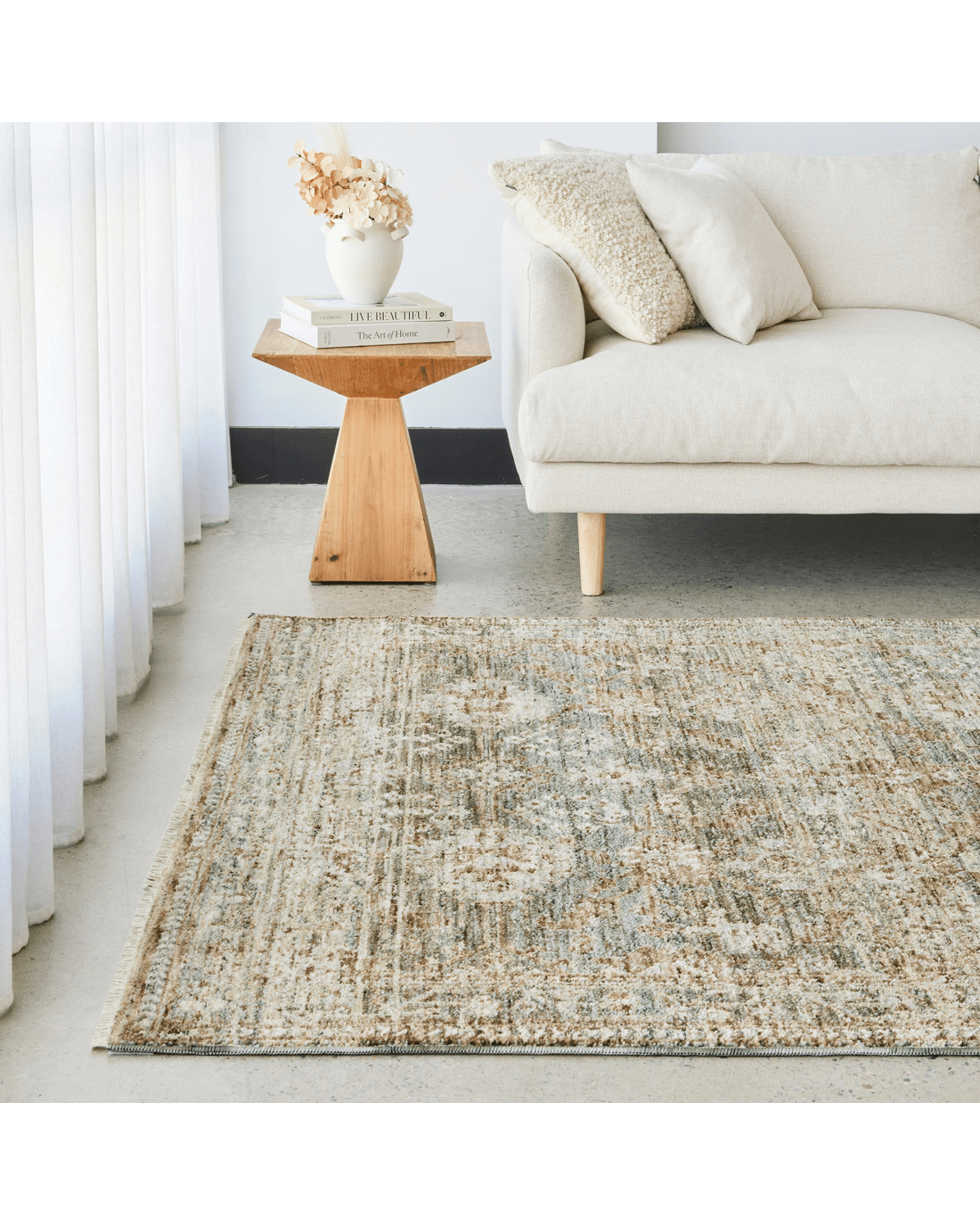 Elegant and effortlessly versatile rug features timeless traditional motifs softened in warm neutrals and faded sandstone. The subtle pattern and distress mimic the look of a vintage heirloom rug, while the neutral palette offers a light and understated presence that complements any interior.