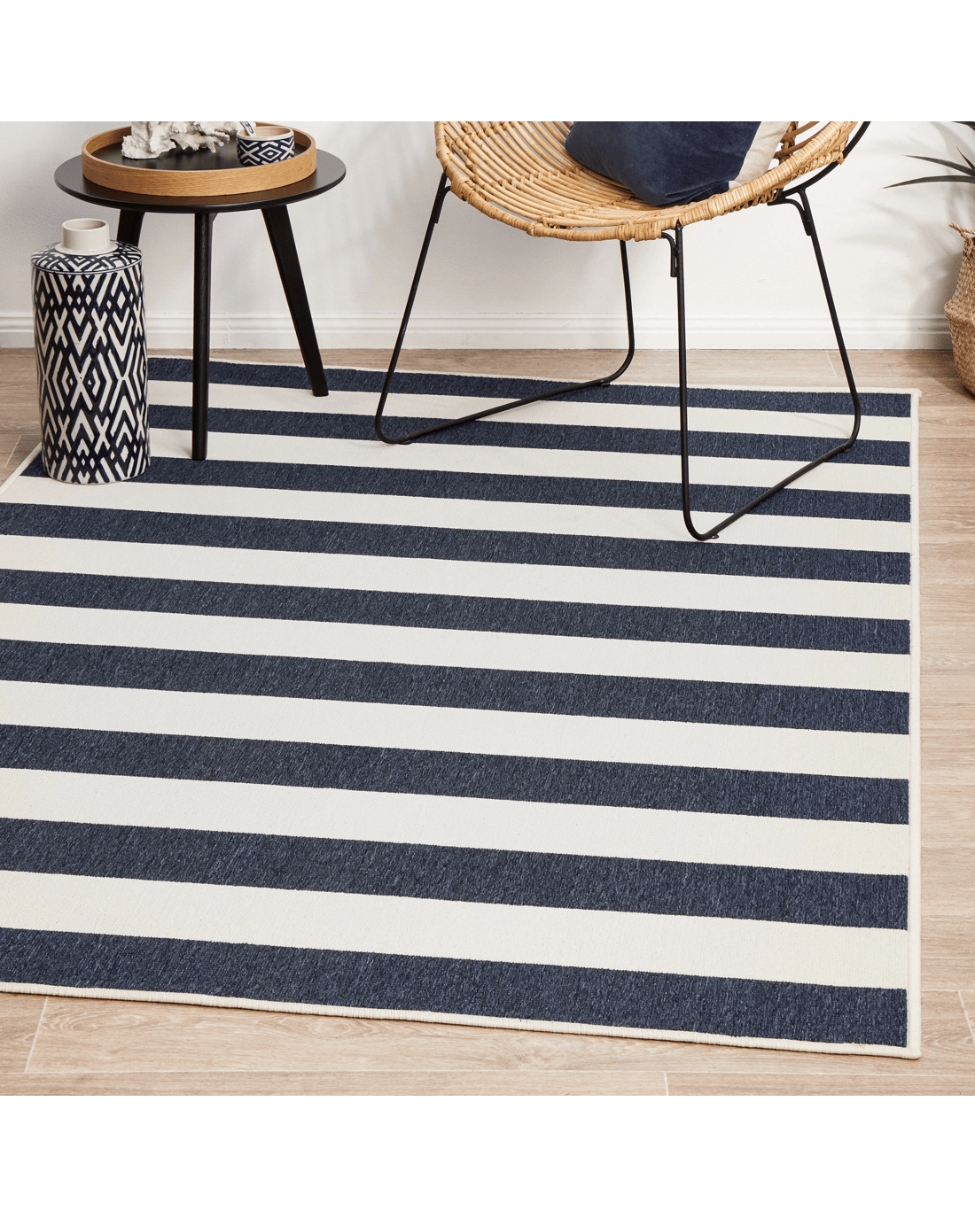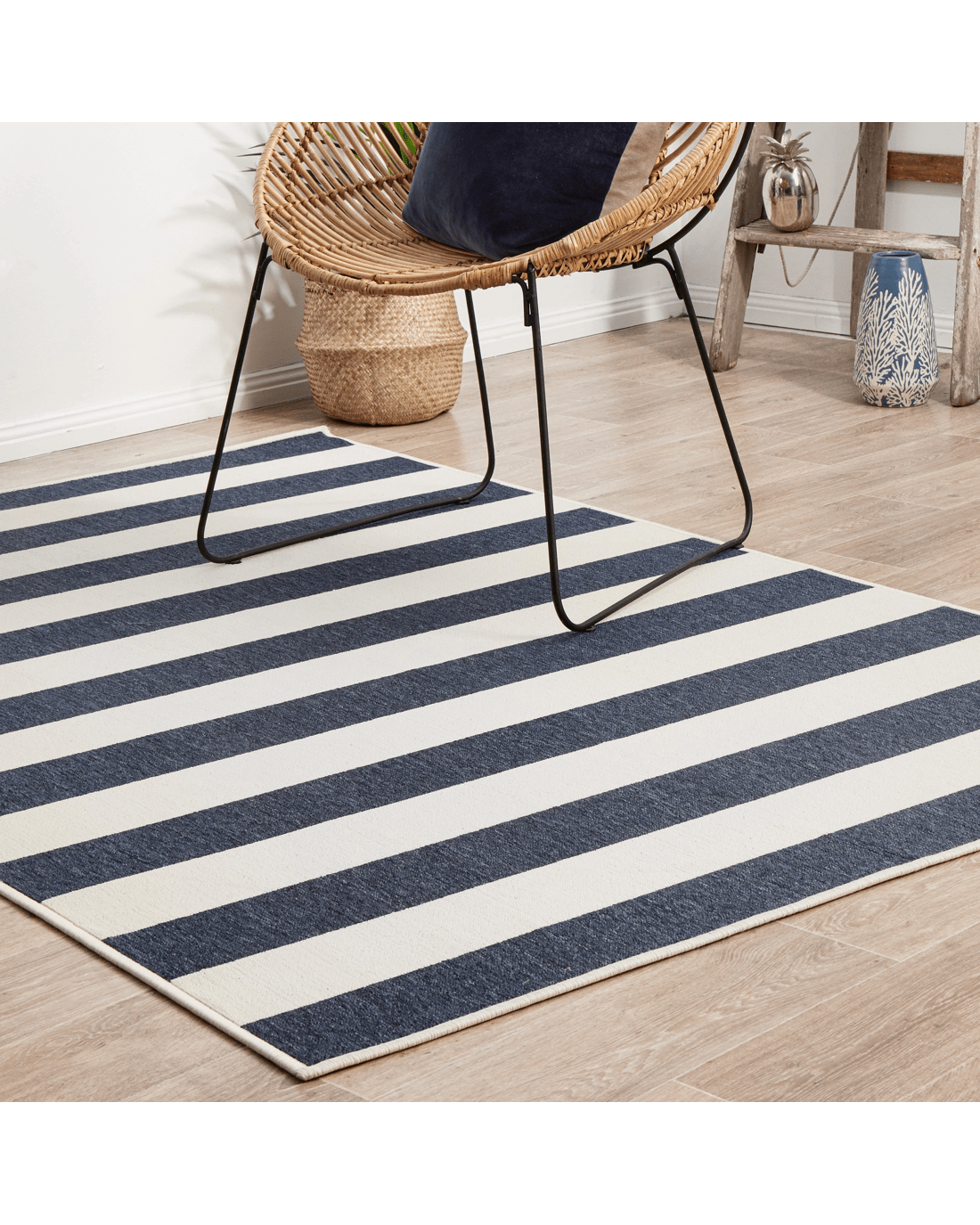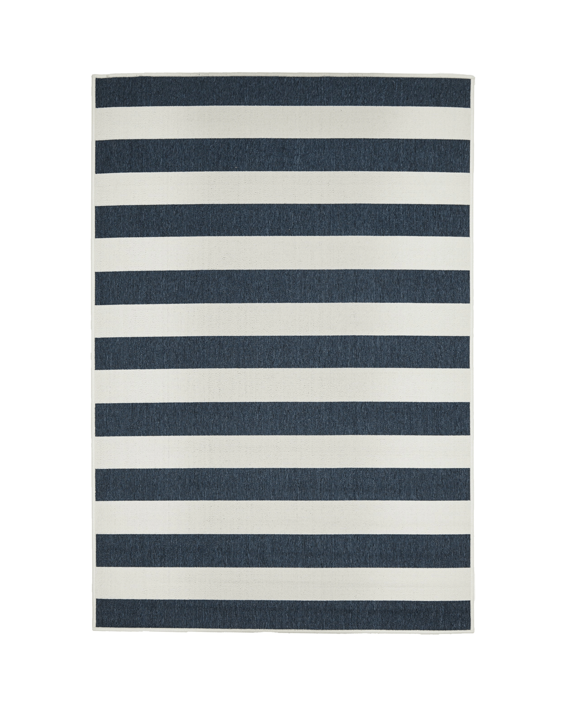 Navy and white stripes create a bit of nautical flair, bringing a coastal look instantly. This easy-care collection is designed to be used outdoors as well as indoors, these rugs are water resistant and will add an element of fun to any space. This short, easy to clean pile made from durable polypropylene and is power loomed.