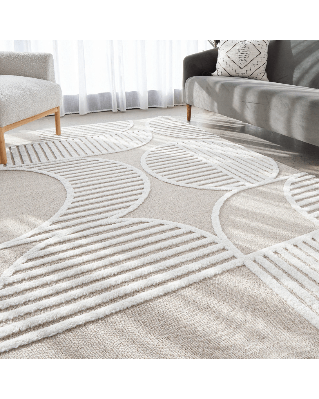 The Nirvana Abbey rug presents a modern masterpiece, where design and function converge to create a visually stunning statement. Featuring curved arches articulated through precise high and low pile details, this rug infuses any room with a touch of sophistication. Its subtle interplay of texture enhances the rug's elegant lines, making it a perfect complement to neutral, modern, or contemporary decor. Available in beige, white, and a harmonious mix of both, the Nirvana Abbey rug offers versatility and style, becoming a focal point that gracefully anchors any interior space.