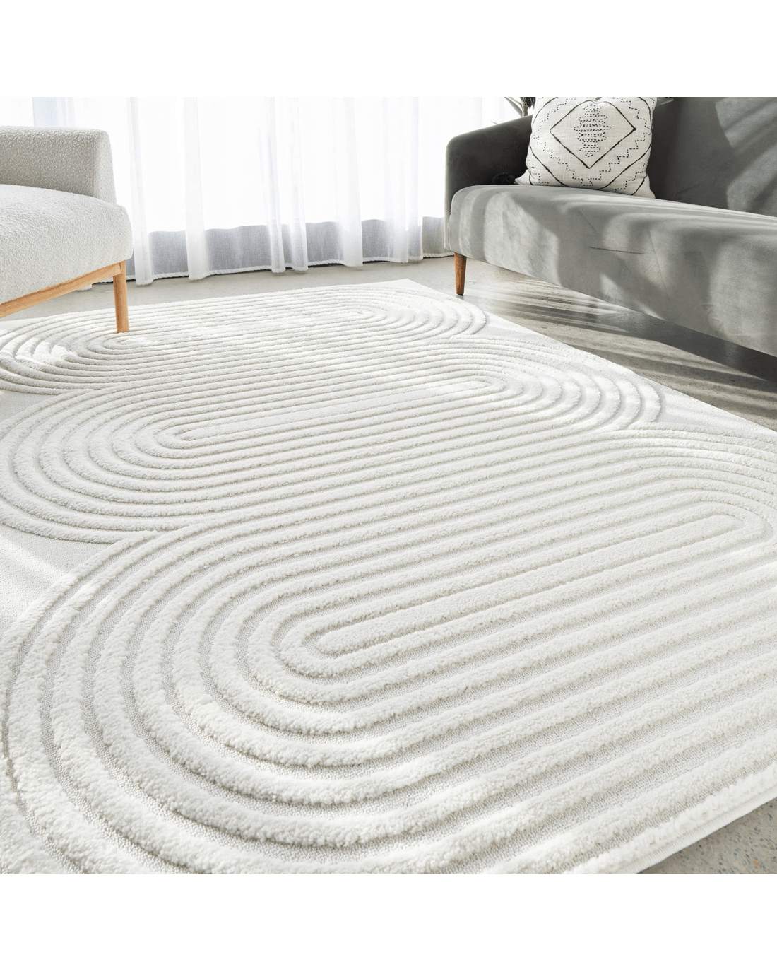 The Nirvana Abbey rug presents a modern masterpiece, where design and function converge to create a visually stunning statement. Featuring curved arches articulated through precise high and low pile details, this rug infuses any room with a touch of sophistication. Its subtle interplay of texture enhances the rug's elegant lines, making it a perfect complement to neutral, modern, or contemporary decor. Available in beige, white, and a harmonious mix of both, the Nirvana Abbey rug offers versatility and style, becoming a focal point that gracefully anchors any interior space.