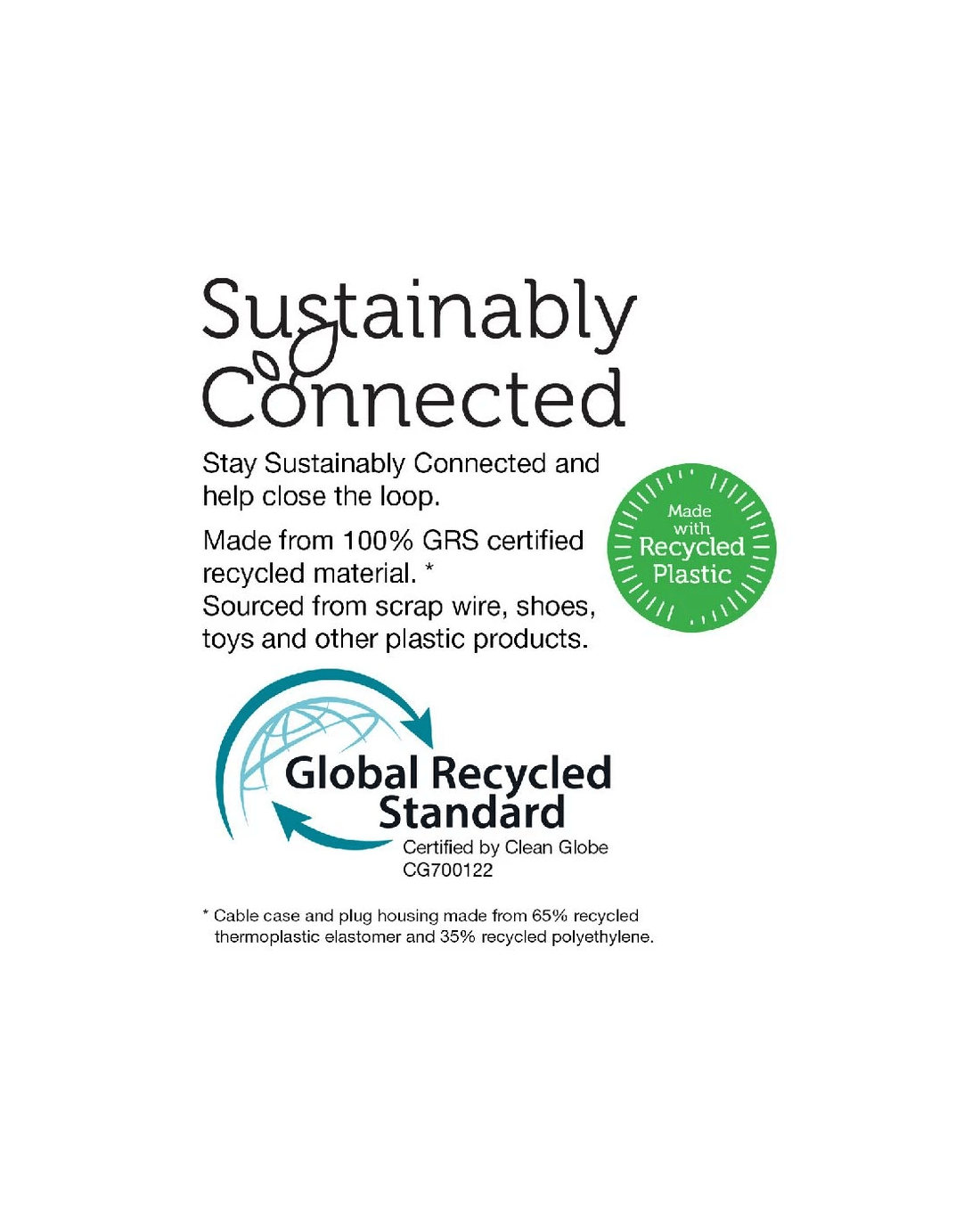 This Comsol GRS USB-A to USB-C Cable is great for connecting, charging and syncing your smartphone and tablet. It's made from material sourced from scrap wire, shoes, toys and other plastic products.