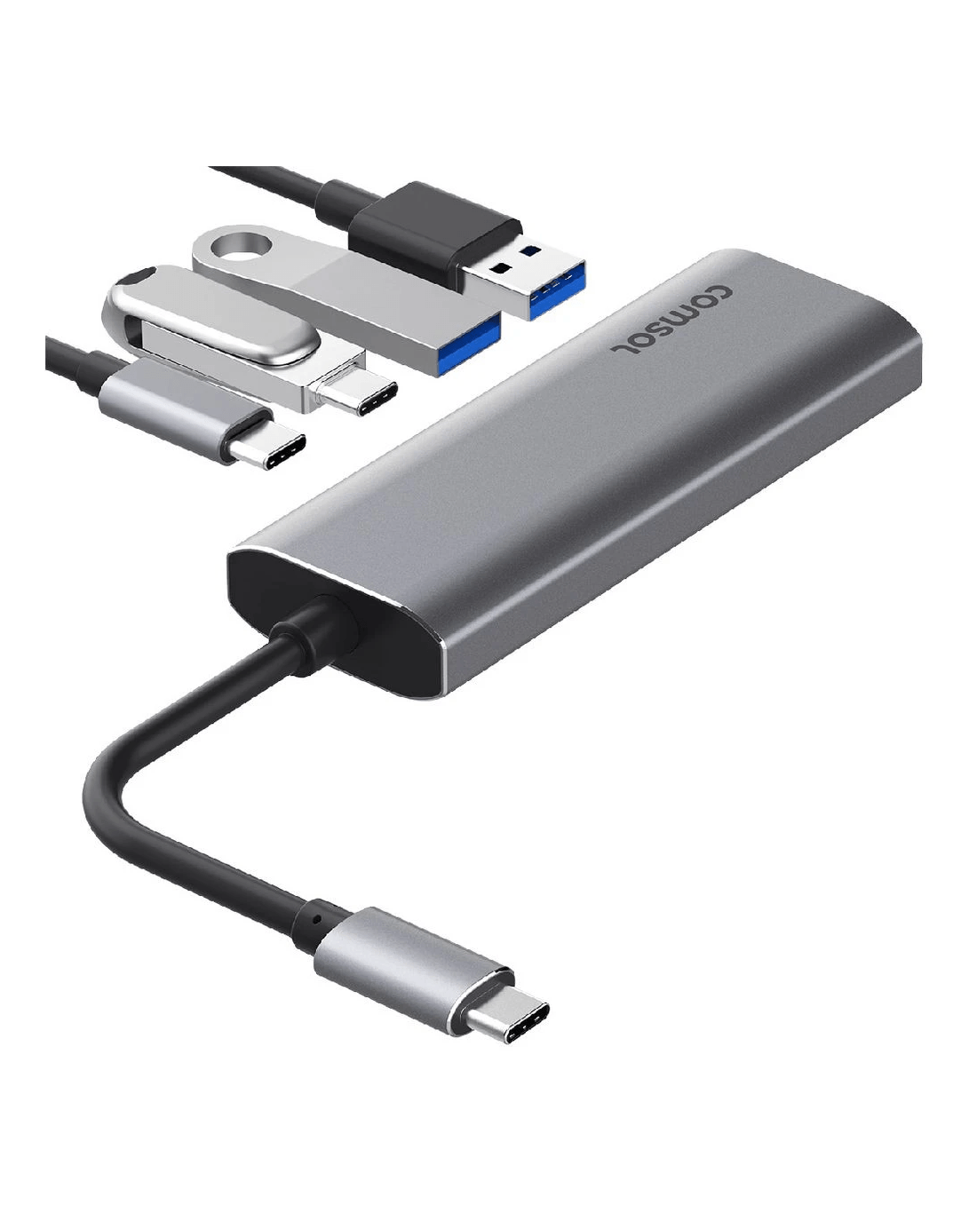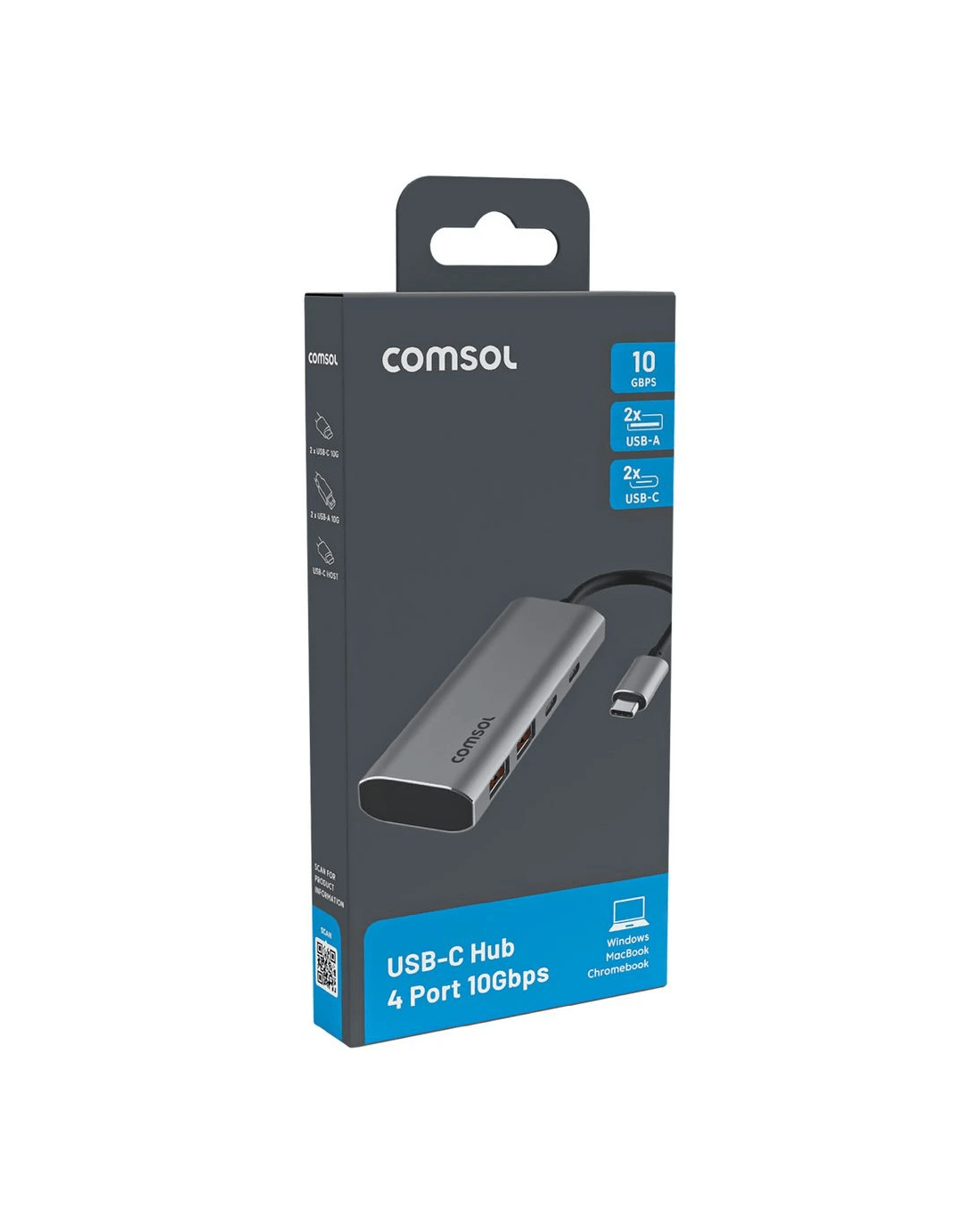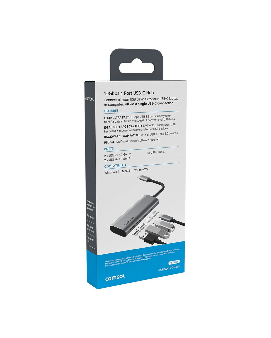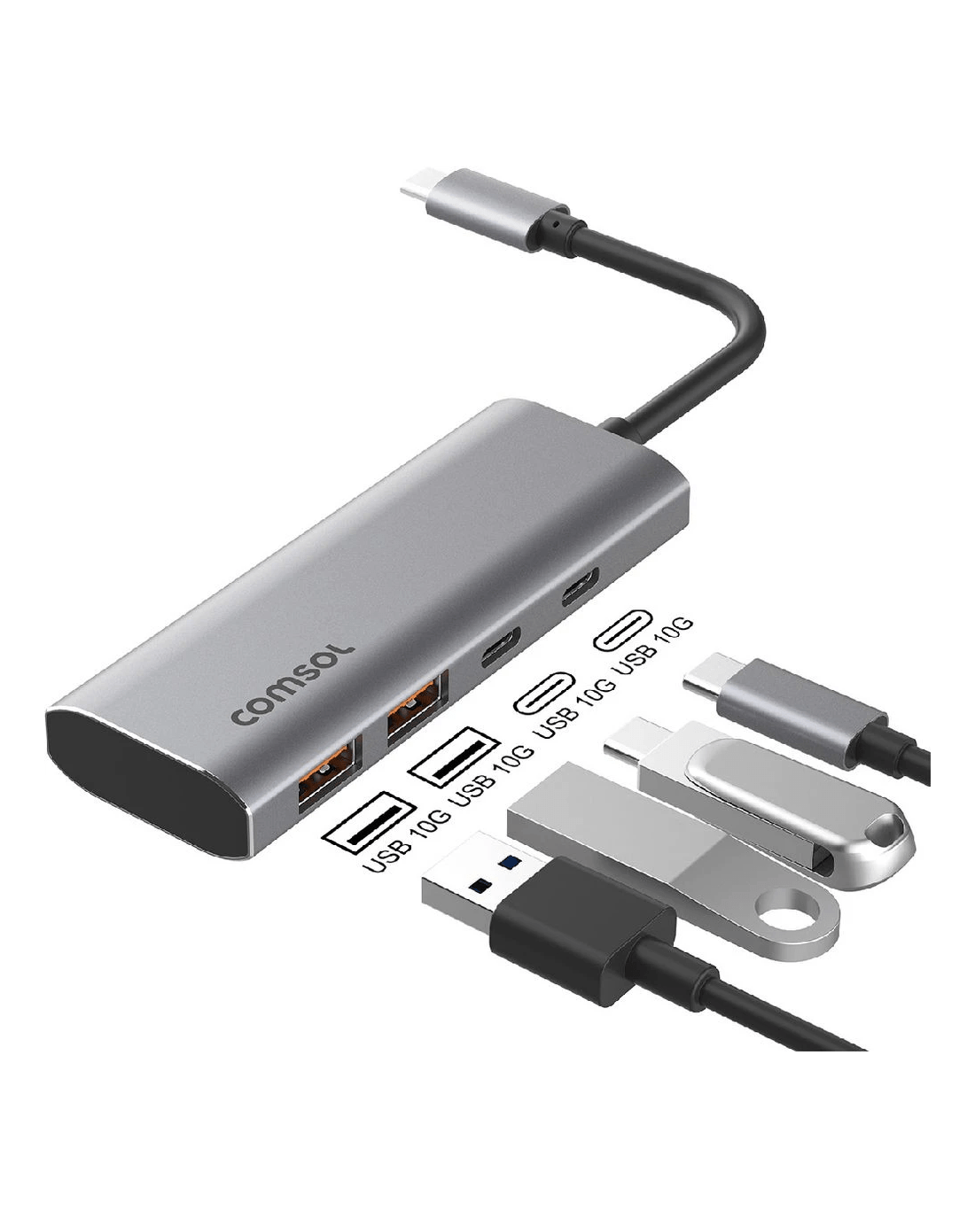 This Comsol USB-C hub lets you connect all your USB devices to your USB-C laptop or computer via a single connection. It has ultra-fast ports that allow transfer speeds of up to 10Gbps. It's easy to set up – just plug in and play with no drivers or software required.