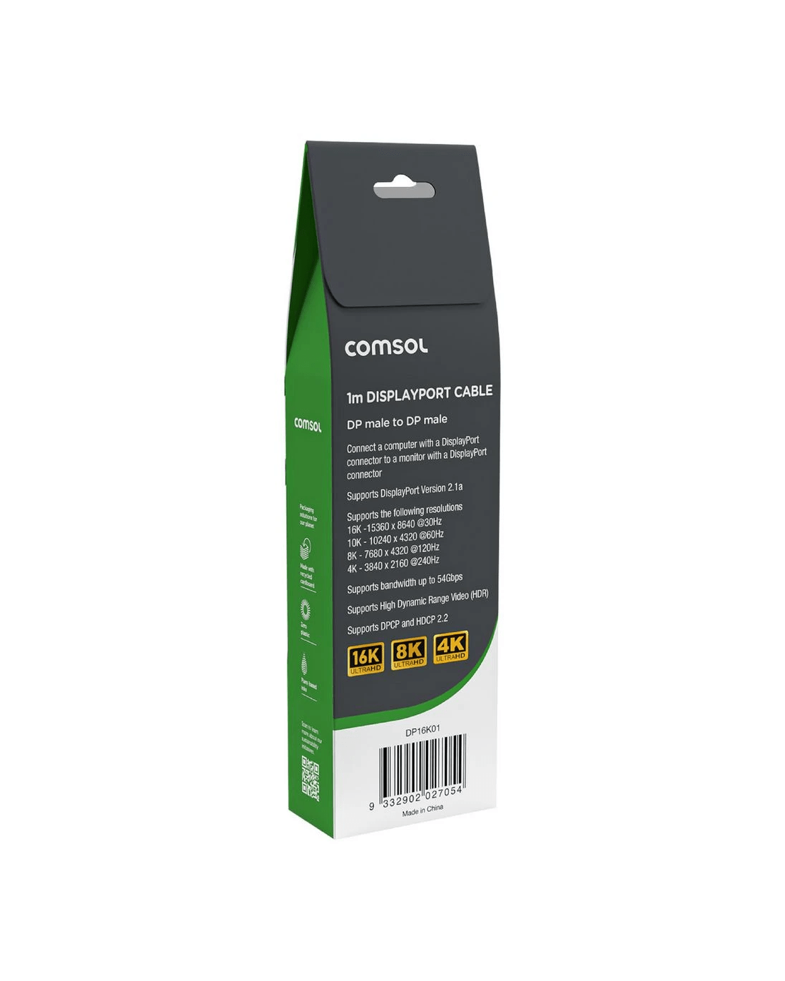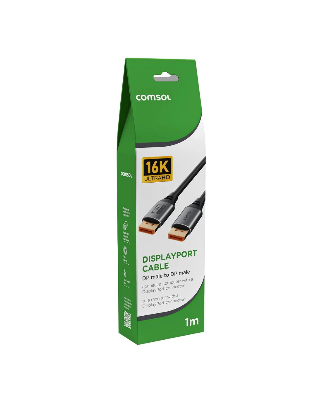 Enjoy a high resolution display on your monitor using this Comsol DisplayPort Cable. It supports resolutions up to 16K and is 1 m long, so it's easy to incorporate in your current home or work setup.