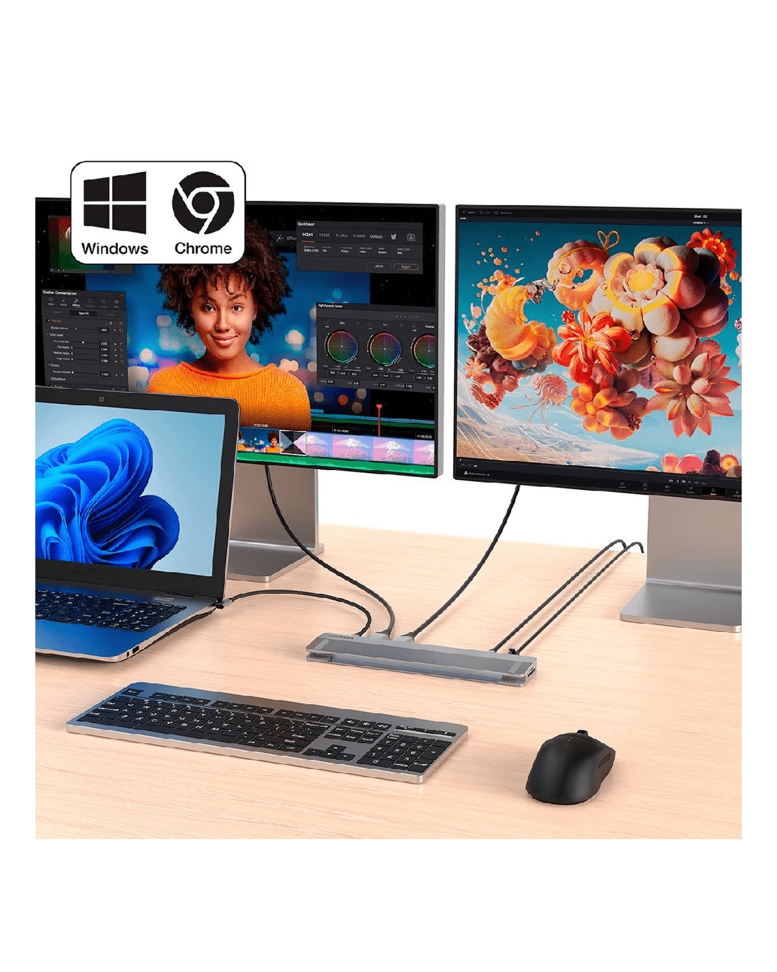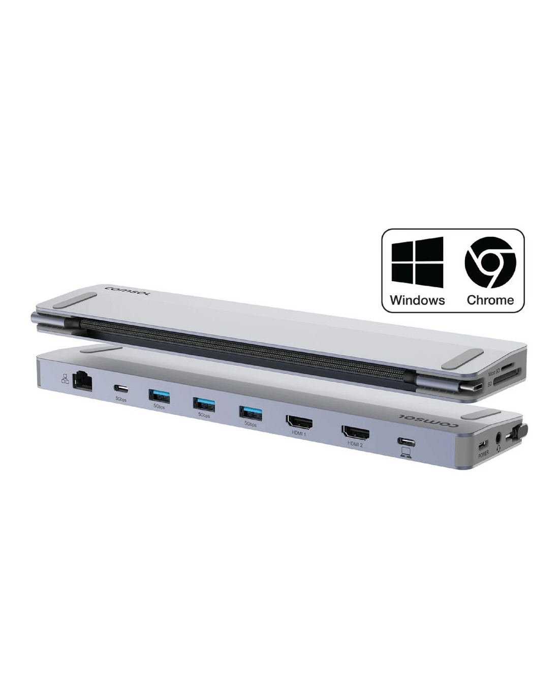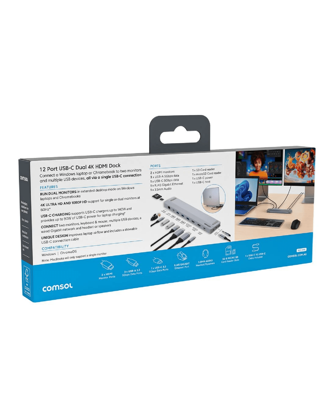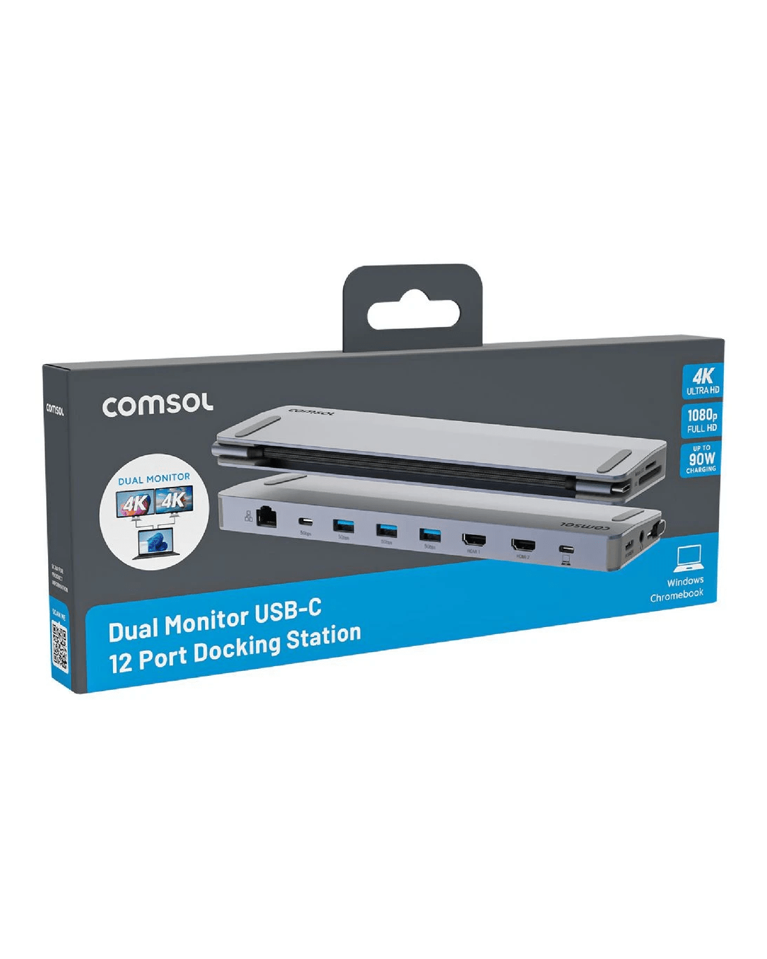 This Comsol Dual Monitor USB-C 12 Port Docking Station has everything you need to connect a Windows laptop or Chromebook to two monitors and multiple USB devices from a single USB-C connection. It has ports for two monitors, a keyboard and mouse, a network connection and your headset and speakers, as well as providing up to 90w of USB-C charging power to your laptop.