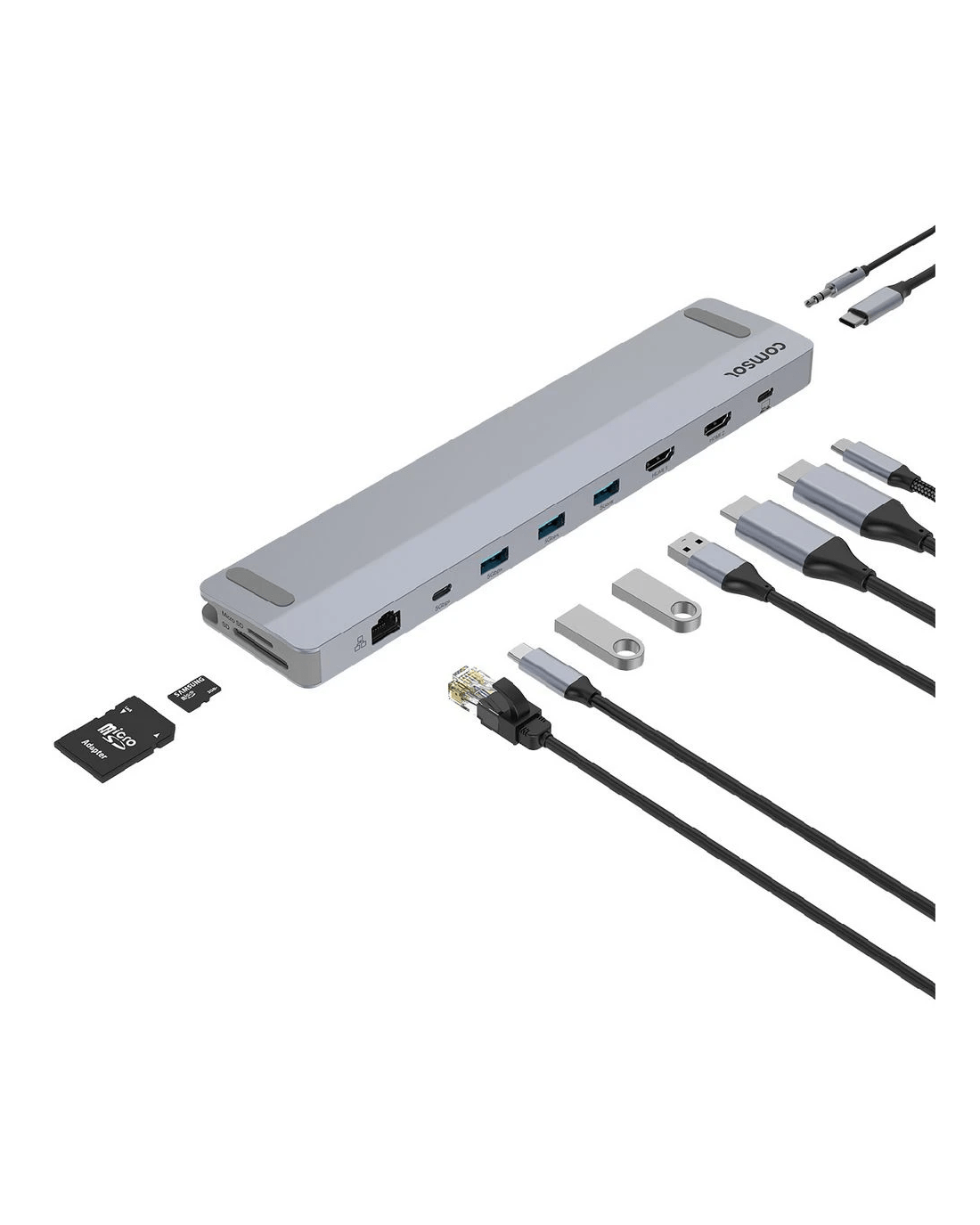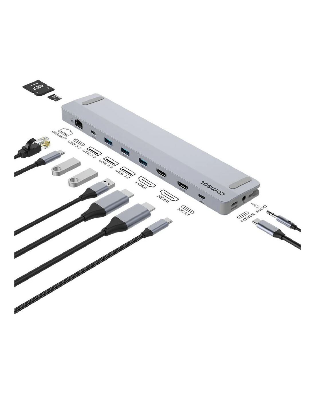 - This docking station features 2x HDMI ports, 3x USB-A ports, 1x USB-C data ports, 1x RJ45 Gigabit Ethernet port, 1x 3.5mm audio port, 1x SD card reader, 1x microSD card reader, 1x USB-C power ports and a USB-C host port.