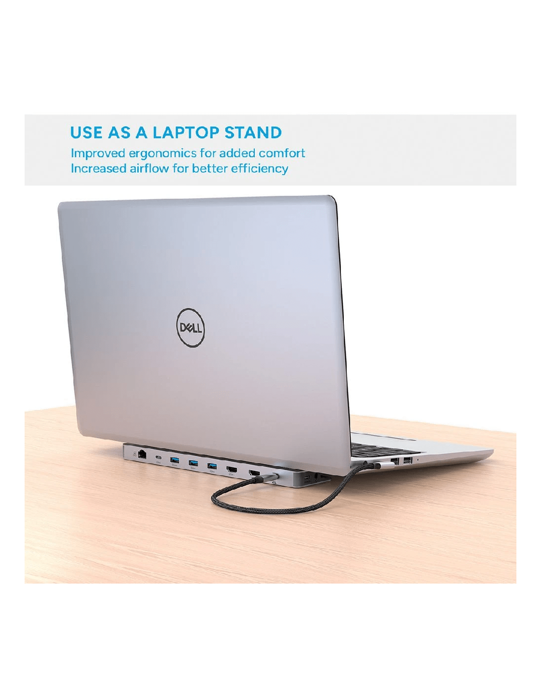 - The design improves laptop airflow and includes a stowable USB-C cable.