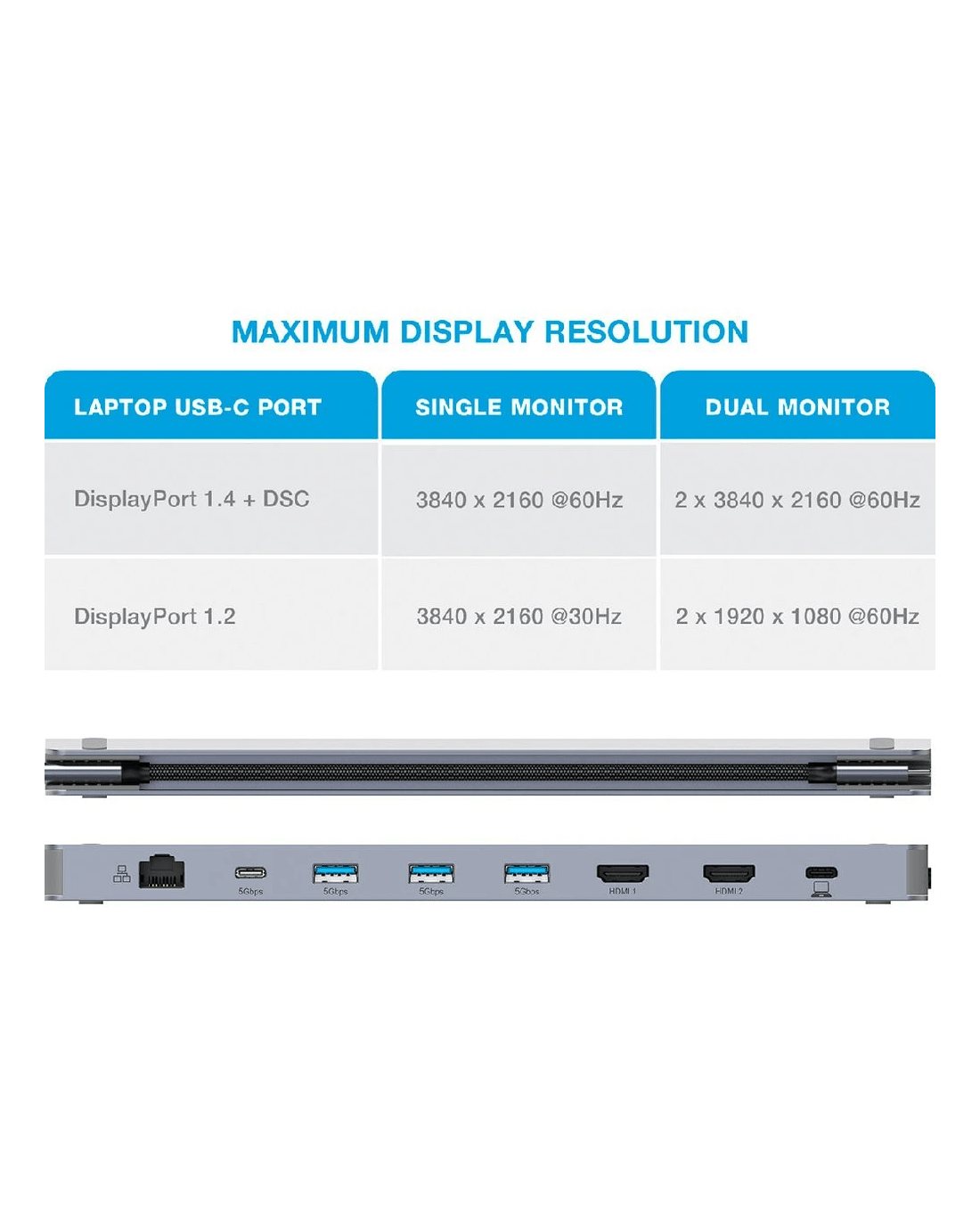 - It supports up to 3840 x 2160 resolutions at 60Hz on dual monitors.
