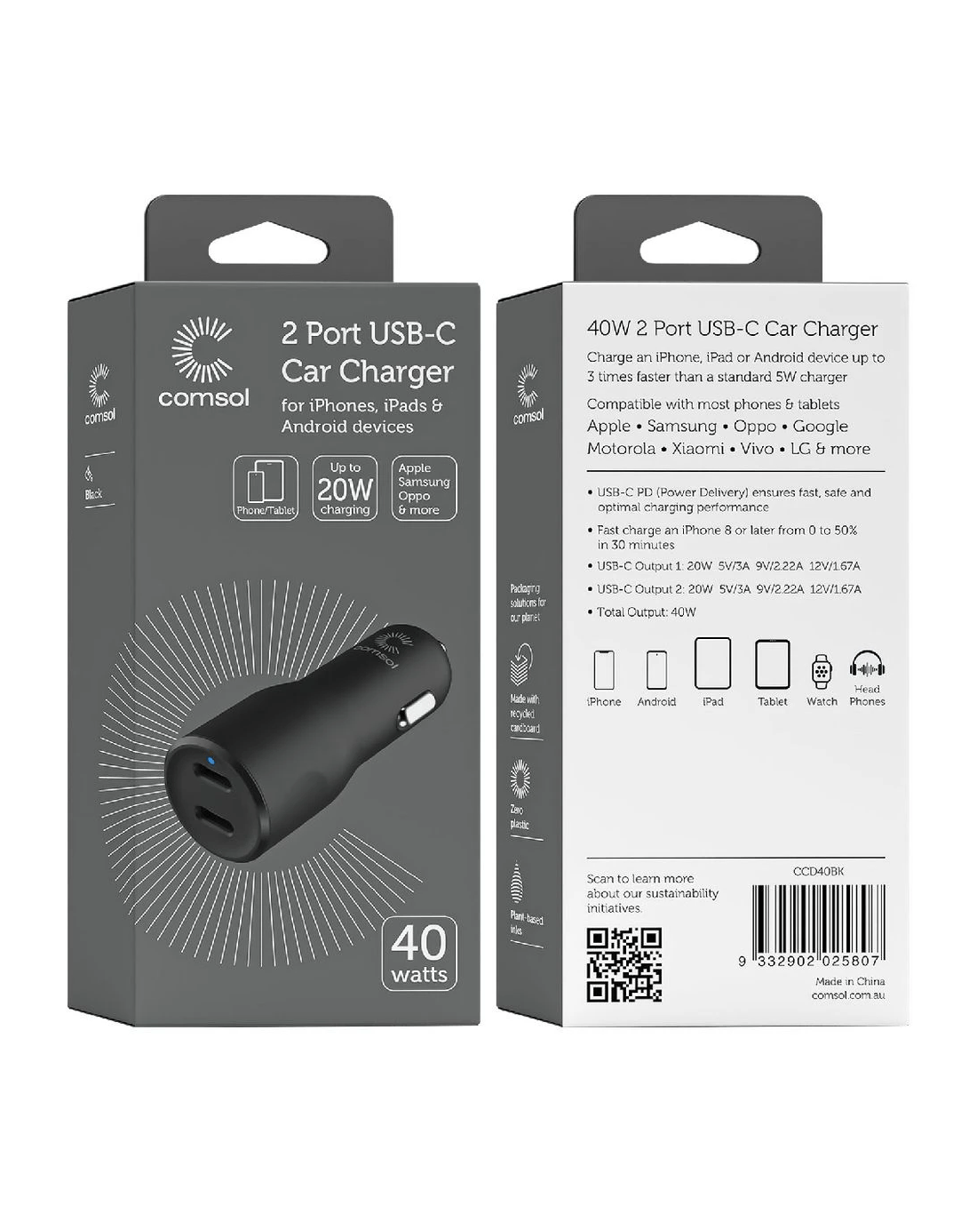 Charge your iPhone, iPad or Android device up to 3 times faster than a standard 5 W charger with this Comsol Dual USB-C Car Charger. Ideal for charging It is compatible with most phones and tablets including Apple, Samsung, Oppo, Google, Motorola, Xiaomi, Vivo, Realme, Sony, Nokia, LG and more. USB-C Power Delivery ensures fast, safe and optimal charging performance every time.